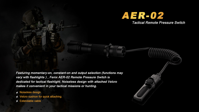 Sie haben nun folgende Möglichkeiten:Der Fenix Kabelschalter AER-02 ist für den taktischen Einsetzt Ihrer Fenix PD35, PD35TAC, TK09, TK15, TK15C, TK22, UC35 designt. Der Fenix Kabelschalter AER-02 wird statt dem Endschalter auf Ihrer Fenix PD35, PD35TAC, TK09, TK15, TK15C, TK22, UC35 geschraubt. Sie können mit dem Fenix Kabelschalter AER-02 direkt auf Moment und Dauerlicht schalten. Mit dem geräuschlosem Schalter ist Ihre Fenix PD35, PD35TAC, TK09, TK15, TK15C, TK22, UC35 optimal für taktische Aufgaben oder die Jagt geeignet.