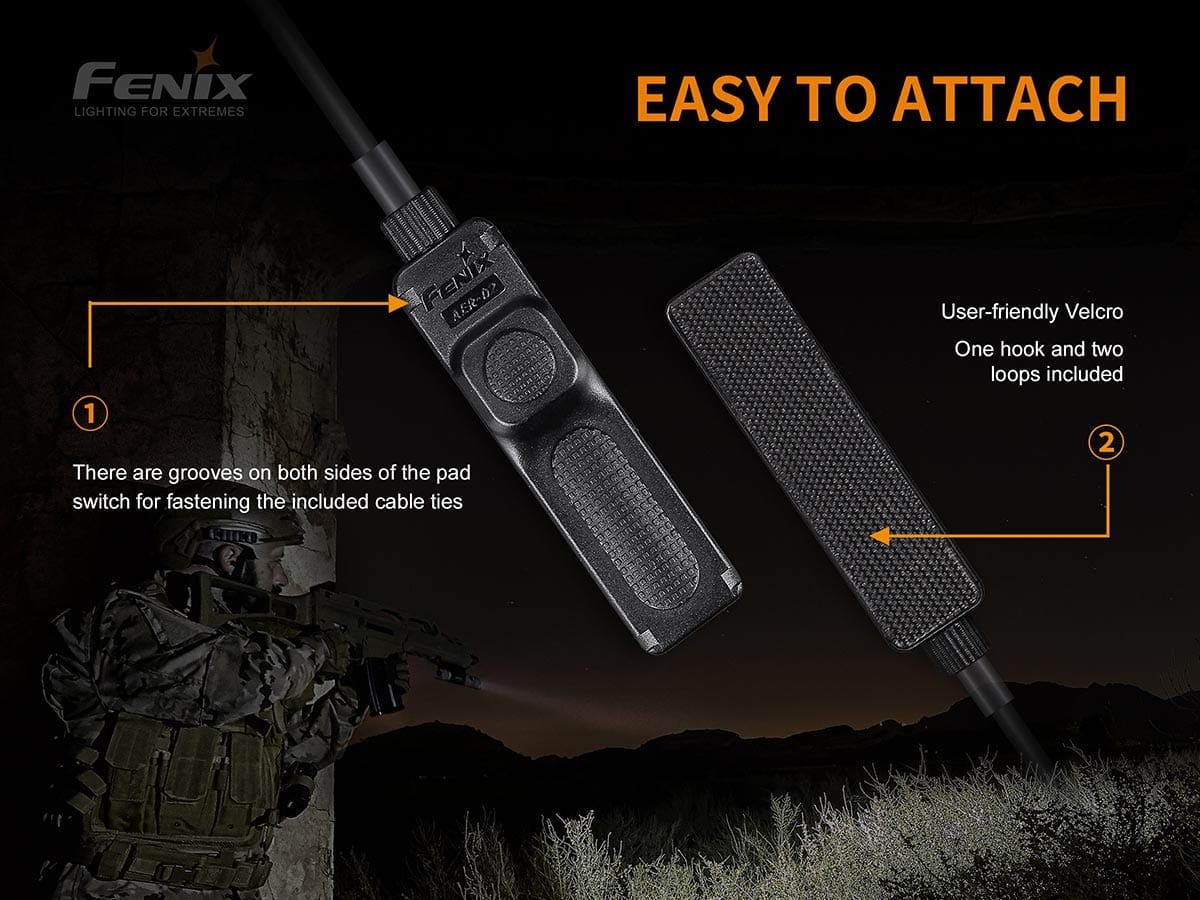 Sie haben nun folgende Möglichkeiten:Der Fenix Kabelschalter AER-02 V2.0 ist für den taktischen Einsetzt Ihrer Fenix PD35, PD35TAC, TK09, TK11 TAC, TK15, TK15C, TK22, UC35, FD41 designt. Der Fenix Kabelschalter AER-02 V2.0 wird statt dem Endschalter auf Ihrer Fenix PD35, PD35TAC, TK09, TK11 TAC, TK15, TK15C, TK22, UC35, FD41 geschraubt. Sie können mit dem Fenix Kabelschalter AER-02 V2.0 direkt auf Moment und Dauerlicht schalten. Mit dem geräuschlosen Schalter ist Ihre Fenix PD35, PD35TAC, TK09, TK11 TAC, TK15, TK15C, TK22, UC35, FD41 optimal für taktische Aufgaben oder die Jagt geeignet.