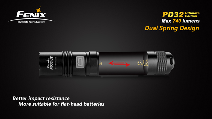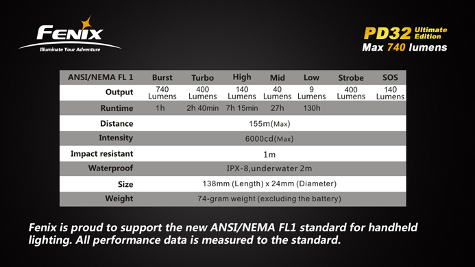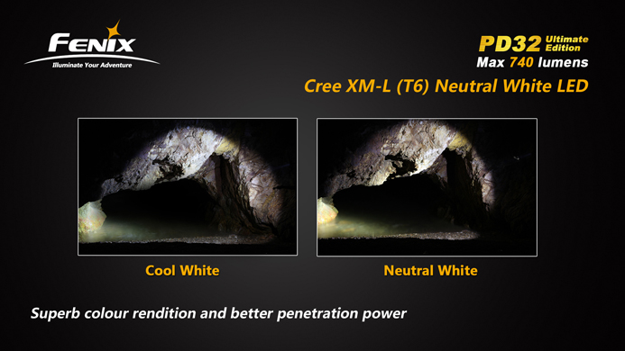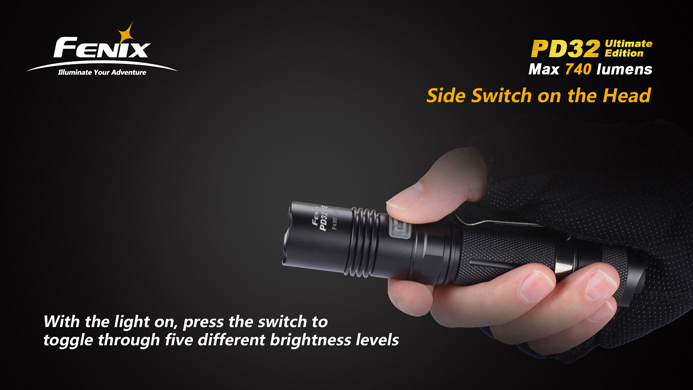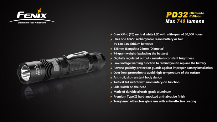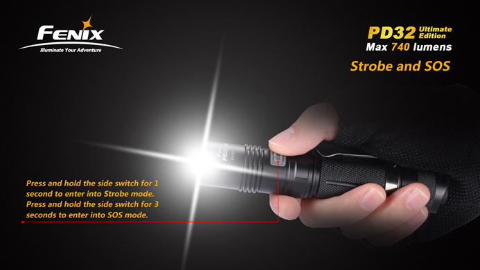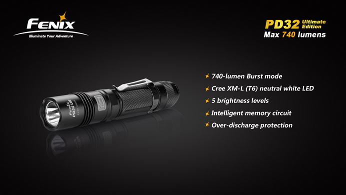 Sie haben nun folgende Möglichkeiten:Manchmal ist gut nicht gut genug! Daher hat Fenix das meist verkaufte Modell PD32 einem Upgrade unterzogen. Die Fenix PD32 Ultimate Edition hat jetzt einen Burst Mode mit 740 Lumen. Nach 3 Minuten schaltet dann die Fenix PD32 Ultimate Edition automatisch auf 400 Lumen zurück. Die Fenix PD32 Ultimate Edition ist mit der aktuellen Cree XM-L (T6) neutral white LED ausgestattet. Mit diesem Licht lassen sich Konturen und Farben bei Nacht besser erkennen. Mit dem Endschalter wird die Taschenlampe ein- und ausgeschaltet. Mit dem seitlich am Kopf angebrachten Druckschalter wird durch die vier Helligkeitsstufen geschaltet. Drückt man auf den Schalter für eine Sekunde, so wird dabei der Selbstverteidigungs-Strobe aktiviert. Ein weitere Druck für 3 Sekunden wechselt dann zum SOS Modus. Die Taschenlampe schaltet nach 3 Minuten im höchsten Modus mit 740 Lumen auf den hohen Modus mit 400 Lumen zurück. Die Errechnete Laufzeit von 2 Stunden ist daher ein kumulierter Wert.