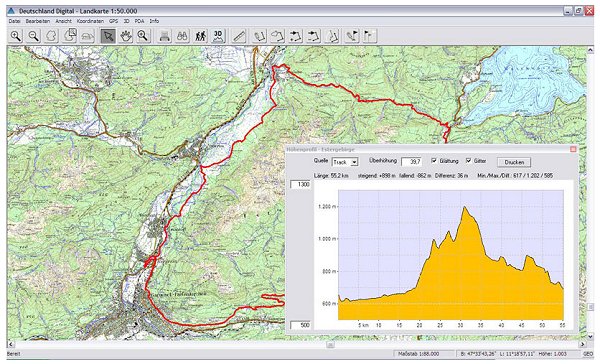 Diverse praktische GPS-Tools, eine plastische 3D-Darstellung einschließlich Flugmodus, ein Straßen-Overlay, ein Satellitenbild, zahlreiche Points of Interest sowie umfangreiche Suchfunktionen erweitern die Funktionen. Von geplanten Touren wird das Höhenprofil mit den zurückzulegenden Höhenmetern und der Strecke exakt erstellt, ebenso von zurückgelegten Touren.