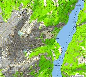 - Höhenlinien, Straßen, Wälder, Seen, Gipfel und Berge