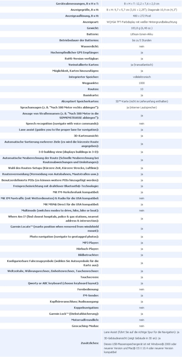 Der Garmin: nüvi 775TFM mit 4,3-Zoll Touchscreen gibt klare Sprachanweisungen und zeigt kommende Fahrmanöver und die einzuschlagende Fahrtrichtung detailliert an. Diese Anzeige umfasst auch Straßenschilder und Pfeile, die die richtige Spur anzeigen. In vielen Städten erscheinen zudem transparente 3D-Ansichten von wichtigen Gebäuden, die dem Fahrer eine realitätsnahe Darstellung seines Standorts bieten. Der Garmin: nüvi 775TFM verfügt über schnellere Kartendarstellungs- und Routenfähigkeiten, die das Zoomen noch reibungsloser machen. Außerdem verfügt das Garmin: nüvi 775TFM über Garmins HotFix-Funktion, für eine schnellere Satellitenerkennung.Darüber hinaus ist der Garmin: nüvi 775TFM standardmäßig mit der beliebten Funktion ?Wo bin ich?? ausgestattet, mit deren Hilfe jederzeit die aktuelle Position, die nächste Adresse und Kreuzung, nahe gelegene Krankenhäuser, Polizeistationen und Tankstellen abgefragt werden können. Außerdem können die Nutzer des Garmin: nüvi 775TFM mithilfe der PhotoNavigation auf der Garmin Website ?Garmin Connect Photos? ihre bevorzugten Bilder mit gespeicherten Standorten verbinden. Dort finden sich auch Millionen von geocodierten Fotos der Google-Foto-Community Panoramio, die mit einem Klick als Navigationsziel auswählt werden können. Die nüvis 755TFM, 765TFM und 775TFM sind standardmäßig mit einem Verkehrsfunkempfänger zur Stauumfahrung ausgestattet. Dank Bluetooth?-Technologie können das neue 765TFM und das 775TFM mit mehr als 400 kompatiblen Mobiltelefonen gekoppelt und als Freisprecheinrichtung genutzt werden. Die Weiterentwicklung der Audioverstärkung ermöglicht ab sofort auch Stereoempfang.
