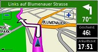 | Routenausgabe: | markierte Route und Abbiegekommandos auf dem Display mit Sprachausgabe (auch Straßennamen) |