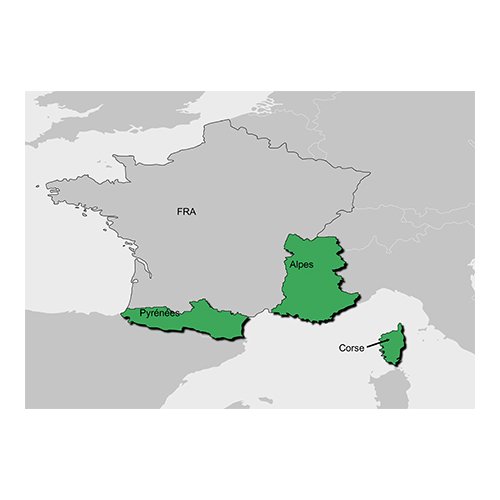 Die Kartendaten bieten eine topografische Abdeckung von Frankreich: Pyrenäen: 64, 65, 31, 09, 11, 66 / Alpen: 01, 74, 73, 38, 26, 05, 84, 04, 13, 83, 06 / Korsika: 2A, 2B