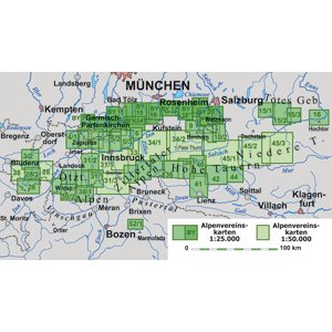 • Schematische Übersichtskarte zur schnellen Orientierung und zur einfachen Auswahl der einzelnen Alpenvereins-Kartenblätter