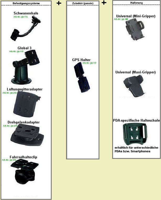und der Gerätehalterung (Universal, PDA-spezifisch) befestigt wird. Der GPS-Halter ist in der Neigung verstellbar und kann mittels der im Gelenk integrierten Schraube
