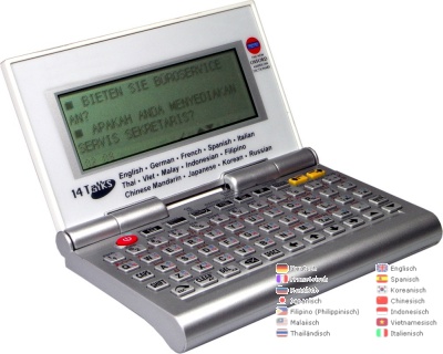 Die Kombinationen aus 14 europäischen, fernöstlichen und orientalischen Sprachen machen aus unseren sprechenden Übersetzungscomputern ideale Begleiter für Geschäfts- und Urlaubsreisen.