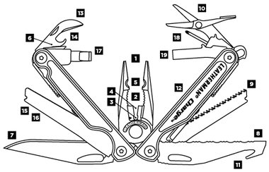 - Zusatztools: Schere mit Federbetätigung, Schneidhaken, Dosenöffner, Kapselheber, Holz-/Metallfeile, Diamantbeschichtete Feile