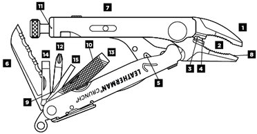 Sie haben nun folgende Möglichkeiten:Das Hauptwerkzeug des Leatherman Crunch ist die Rohrzange mit Stellschraube für 1-Zoll Rohre. Unter der Stellschraube befindet sich ein 1/4 Zoll Sechskant-Bithalter. Mit der Holz-/Metallfeile, dem Wellenschliffmesser, Drahtschneider und verschiedene Schraubendreher sind Sie für den Einsatz im Installationsbereich gewappnet.