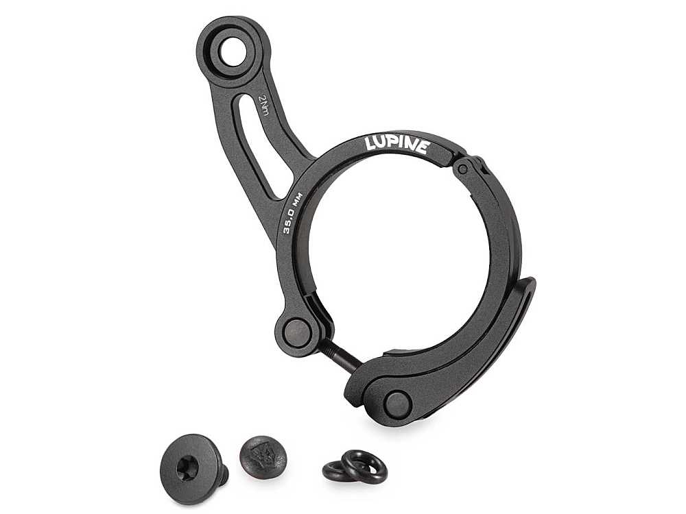Lupine Schnellspanner 35mm (d1235) für die Lupine Blika, Neo, Piko zur Montage an Stangen mit passendem Durchmesser. Er besteht aus CNC-gefrästem, schwarz eloxiertem Aluminium. Die Gummiauflage verhindert Kratzer und sorgt für festen Halt. Abstand vom Befestigungsloch der Halterschraube zum Halterrand ca. 20mm, Schellenbreite 9mm.
