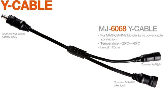 Das Magicshine MJ 6068 Y - Kabel kommt zum Einsatz beim Anschluß von einer MJ 880 Eagle Eye + einer weiteren Magicshine Lampe oder von einer MJ 880 Eagle Eye und einem Rücklickt, gekoppelt mit einem Akku. Alternativ kann das Magicshine MJ 6068 Y- Kabel zum gleichzeitigen Laden des Akku und Betrieb Ihrer Magicshine MJ 880 Eagle Eye verwendet werden. Sie können sowohl ein 220V Netzladegerät wie auch ein KFZ Ladegerät verwenden.