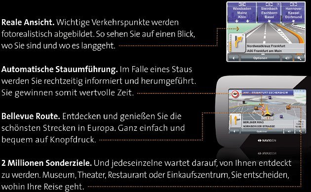 | Zusätzliche Informationen in Karte bzw. Display: | Reale Ansicht, Geschwindigkeitsassistent, Fahrspurassistent, Sonderziele, schnellste, kürzeste, schönste, optimalste Route, Fahrtenbuch, u.v.m. |