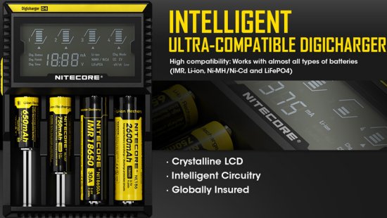 NiteCore Digicharger D4 - 4-Schacht Universal Schnellladegerät für Li-Ion, Ni-MH, Ni-Cd und LiFePO4 Akkus