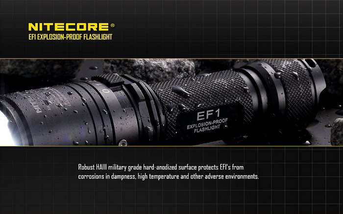 Sie haben nun folgende Möglichkeiten:Die Nitecore EF1 ist eine LED Taschenlampe mit Explosionsschutz für den Einsatz mit Gefahrenstoffe. Das besondere bei der Nitecore EF1 ist das Aluminiumgehäuse und die CREE XM-L2 U3 LED mit 830 Lumen im ANSI/NEMA FL-1 Standard. Die meisten anderen Taschenlampe mit Explosionsschutz sind aus Kunststoff und verfügen über eine schwächere Lichtleistung. Durch die einfache Schiebeschalterbedienung am Lampenkopf der Nitecore EF1 kann man in die verschiedenen Modi schalten. Die Nitecore EF1 verfügt über 3 Leuchtstufen. Das Gehäuse der Nitecore EF1 besteht aus HAIII anodisierten Luftfahrt-Aluminium und ist Spritzwassergeschützt nach IPX-67.
