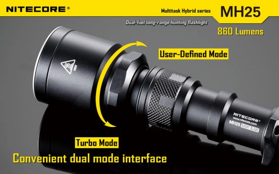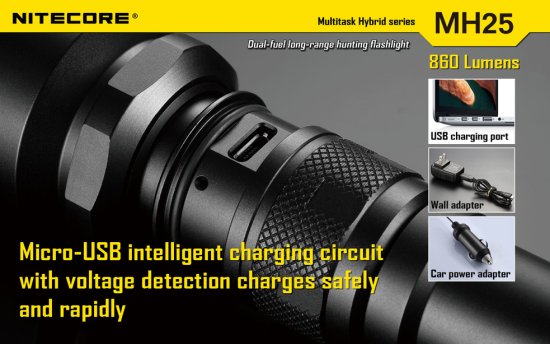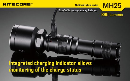 Sie haben nun folgende Möglichkeiten:Die Nitecore MH25 HUNTING KIT ist eine LED Taschenlampe mit 860 Lumen im ANSI/NEMA FL-1 Standard. Mit einem 18650 Li-Ion Akku erreicht die Nitecore MH25 HUNTING KIT eine Laufzeit von bis zu 28 Stunden. Falls dies nicht reicht können Sie den Akku direkt über das eingebaute Ladegerät in der Lampe aufladen. Durch drehen am Lampenkopf der Nitecore MH25 HUNTING KIT kann man in die verschiedenen Modi schalten. Das Gehäuse der Nitecore MH25 HUNTING KIT besteht aus HAIII anodisierten Luftfahrt-Aluminium und ist Spritzwassergeschützt nach IPX-8.