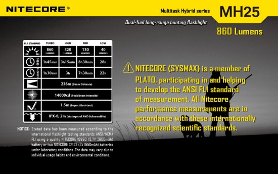 Nitecore gehört der PLATO (Portable Lights American Trade Organization) an und die Lichtleistung der Lampe werden im ANSI/NEMA-FL-1 Standard gemessen. Dieser Standard erlaubt es die wirklich gemessene Lumen der Lampe mit anderen zu vergleichen. Gemessen und auf Verpackungen angegeben werden nach diesem Standard: