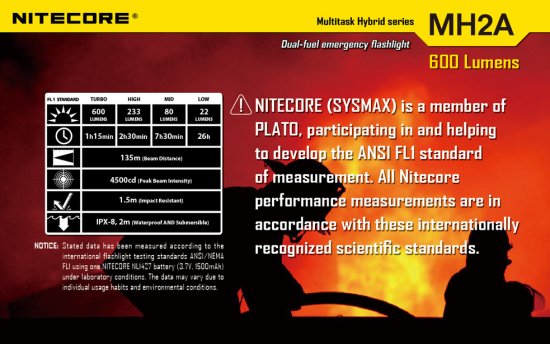 Nitecore gehört der PLATO (Portable Lights American Trade Organization) an und die Lichtleistung der Lampe werden im ANSI/NEMA-FL-1 Standard gemessen. Dieser Standard erlaubt es die wirklich gemessene Lumen der Lampe mit anderen zu vergleichen. Gemessen und auf Verpackungen angegeben werden nach diesem Standard: