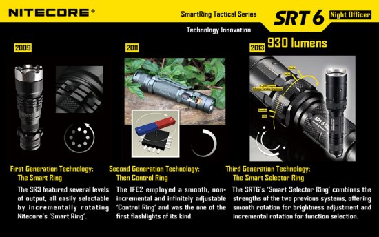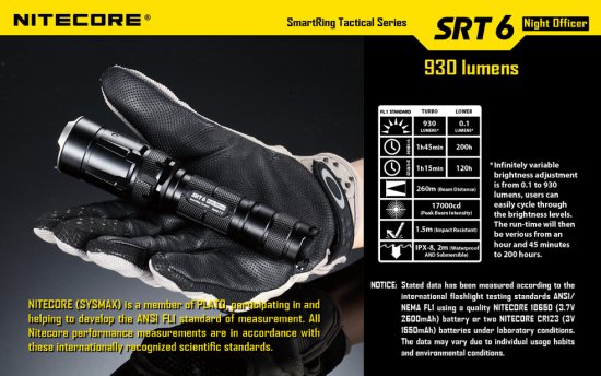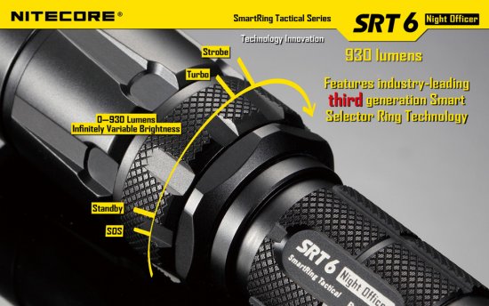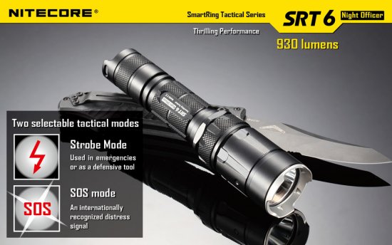 Sie haben nun folgende Möglichkeiten:Die Nitecore SRT6 Night Officer ist eine LED Taschenlampe mit 930 Lumen im ANSI/NEMA FL-1 Standard. Der Smart-Selektorring der 3. Generation ermöglicht ein stufenlose Regelung der Helligkeit von 0,1 Lumen bis 930 Lumen. Über den Smart-Selektorring der Nitecore SRT6 Night Officer lässt sich auch die Strobo und SOS Funktion schalten. Mit zwei CR123 Batterien erreicht die Nitecore SRT6 Night Officer eine Laufzeit von bis zu 120 Stunden. Die LED Lampen der SmartRing Tactical Series verfügen über eine Batteriestandanzeige mit Notlichtfunktion. Das Gehäuse der Nitecore SRT6 Night Officer besteht aus HAIII anodisierten Luftfahrt-Aluminium und ist Spritzwassergeschützt nach IPX-8.