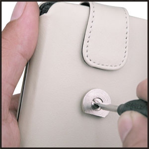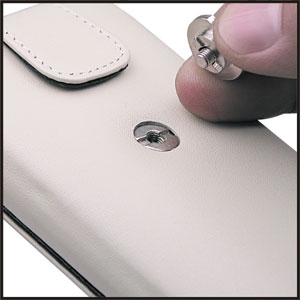 Die Schutzhüllen werden mit einem Knopf geliefert, in den das Logo Noreve St. Tropez eingraviert ist. Dieser schützt die Rückseite der Schutzhüllen und macht sie vollkommen flach (Benutzer, die keinen Gürtelclip verwenden möchten, wissen dies zu schätzen). Als erster Schritt wird der rückseitige Knopf mit der Noreve St. Tropez Gravur mit dem Schraubenzieher abgeschraubt. Dann das Metallteil in der rückseitigen Halterung der Schutzhülle positionieren (zwei Kerben helfen bei der richtigen Ausrichtung. |