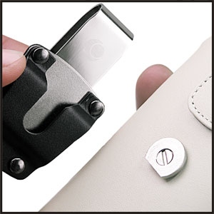 Die Halterung auf der Rückseite der Ledertasche gleitet ganz einfach horizontal in den Clip hinein. Durch eine leichte Drehung in die eine oder andere Richtung arretiert der Gürtelclip die Ledertasche und verhindert, dass diese aus ihrer Aufnahme herausrutscht. Dennoch lässt der Clip eine Drehung um 360° zu. Somit ist es möglich, die Ledertasche um 90° zu drehen, um sie in die vertikale Position zu bringen, oder um 180° (entgegen der Richtung, in der sie eingeschoben wurde), um sie in die horizontale Position zu bringen, ohne dass Sie Ihr Ledertasche verlieren können.