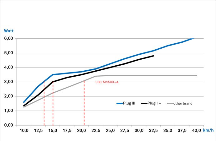 - Wandelt ab 12 km/h Dynamo-Wechselstrom in USB Strom