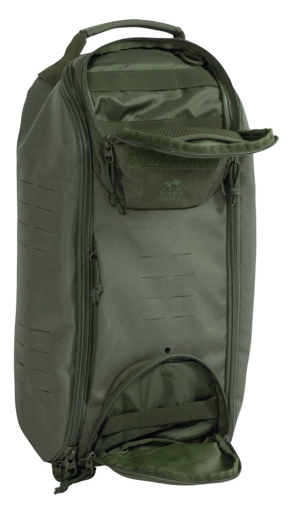 - Komplett aufziehbares Hauptfach mit 2-Wege RV, 2 Einschubfächer mit Klettverschluss, 3 RV-Netztaschen und Lasercut MOLLE-Klettflächen