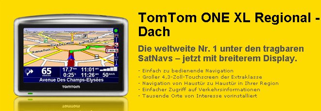 | 1. TomTom ONE XL Die weltweite Nr. 1 unter den tragbaren SatNavs ? jetzt mit breiterem Bildschirm und vorinstallierten Kartendaten. |