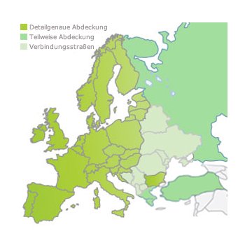 - Detailgenaue Abdeckung: Andorra, Belgien, Dänemark, Deutschland, Finnland, Frankreich, Gibraltar, Griechenland, Irland, Italien,Liechtenstein, Luxemburg, Malta, Monaco, Niederlande, Norwegen, Österreich, Portugal, San Marino, Schweden, Schweiz, Spanien (inkl. Kanarische Inseln), Türkei, Vatikanstadt, Vereinigtes Königreich (inkl. Kanalinseln)