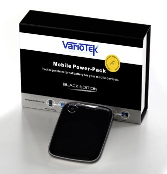 Mit dem VarioTek Mobile Power Pack (VT-PP-320B) mit 5000mAh können elektronische Kleingeräte wie Ihr Handy, PDA, MP3-Player, Fotoapparat, GPS-Empfänger etc. aufladen. Akku leer und keine Stromquelle vorhanden oder kein Ladegerät dabei gehört der Vergangenheit an.