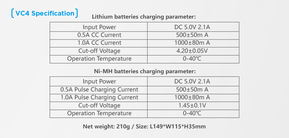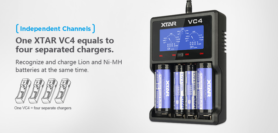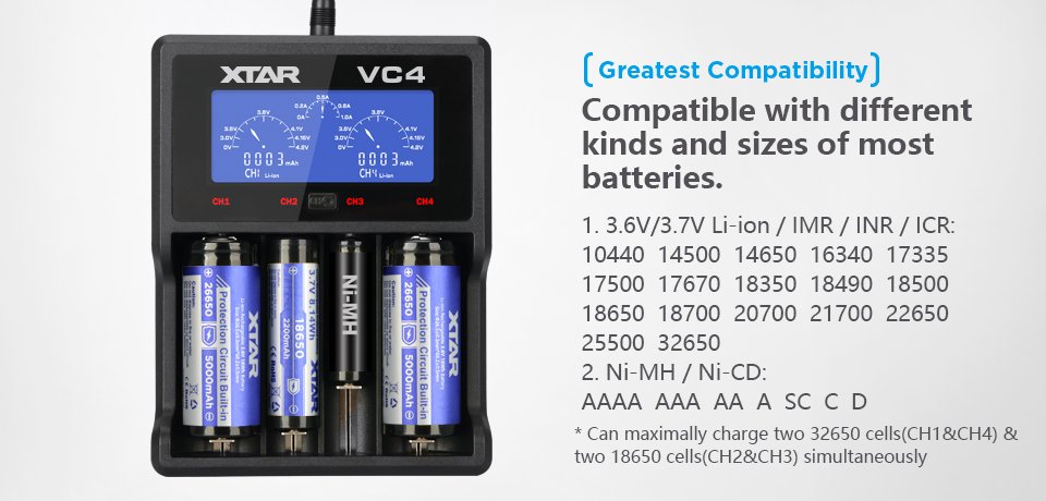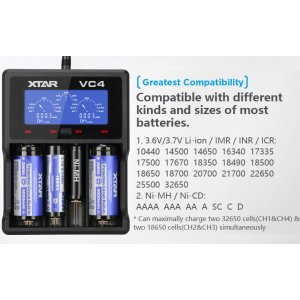 Xtar VC4 - 4-Schacht Universal Schnellladegerät für IMR / Li-ionAkkus: 32650, 26650, 18650, 17670, 18490, 17500, 17335, 16340 (RCR123), 14500, 10440, Ni-MH/Ni-CD: AAAA, AAA, AA, A, SC, C, D