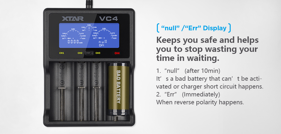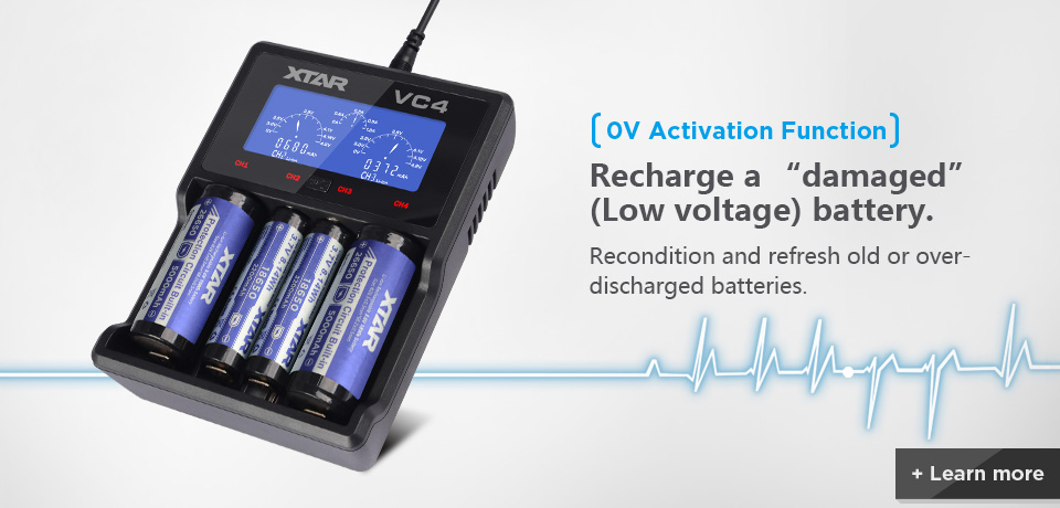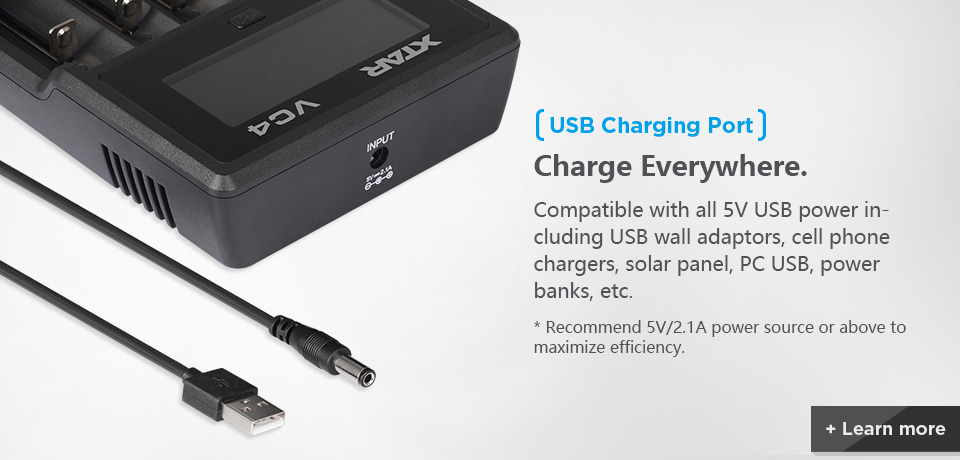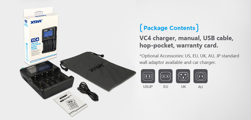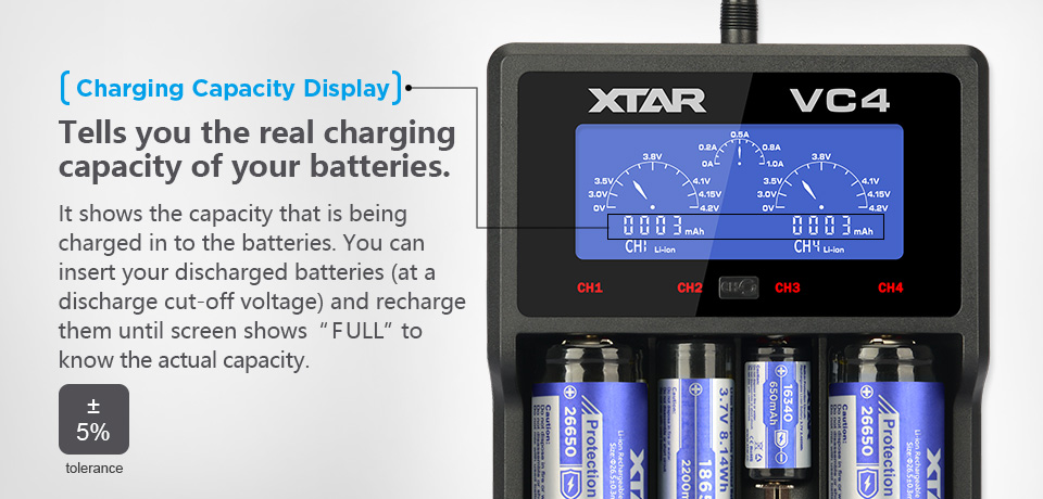 Sie haben nun folgende Möglichkeiten:Das Xtar VC4 ist ein leistungsstarkes 4-Schacht Ladegerät, dass über das USB-Kabel mit einem beliebigen USB Netzteil oder KFZ-Stecker angeschlossen werden kann. Folgende Akkutypen sind Ladbar: 3,6V / 3,7 V Li-ion / IMR / INR / ICR: 10440 / 14500 / 14650 / 16340 / 17500 / 17670 / 18350 / 18490 / 18500 / 18650 / 18700 / 22650 / 25500 / 26650 / 32650 , Ni-MH / Ni-CD: AAAA / AAA / AA / A / SC / C / D. Das LED-Display informiert Sie exakt über den Ladevorgang und Ladestrom. Es können verschieden Akkus gleichzeitig geladen werden. Die intelligente Schaltung der Ladestation wählt den optimale Lademodus für den jeweiligen Akku.