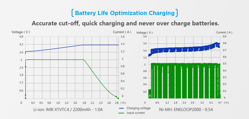 Die Ladegeschwindigkeit (Ladestrom) der Akkus ist von der USB Stromversorgung abhängig. Empfohlen werden min 2000 mA USB-Ladegeräte. Es ist möglich auch schwächere USB-Stromversorgung zu wählen jedoch ist das Aufladen der Akkus bei der voller Stromstärke nicht mehr möglich. Laden mit niedriger Stromversorgung bittet Vorteile bei kleinen Akkus die mit niedrigen Strom geladen werden dürfen. Das Aufladen von Großen Akkus zieht sich dadurch in die Länge.