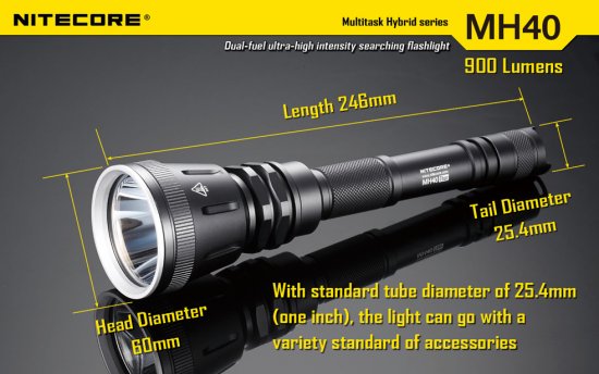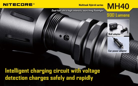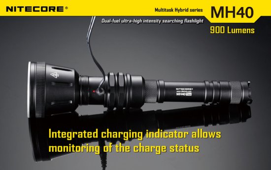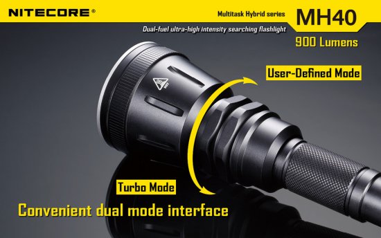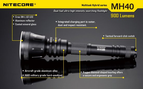 Die Nitecore MH40 ist eine LED Taschenlampe mit 900 Lumen im ANSI/NEMA FL-1 Standard. Mit zwei 18650 Li-Ion Akku erreicht die Nitecore MH40 eine Laufzeit von bis zu 105 Stunden. Falls dies nicht reicht können Sie den Akku direkt über das eingebaute Ladegerät in der Lampe aufladen. Durch drehen am Lampenkopf der Nitecore MH40 kann man in die verschiedenen Modi schalten. Das Gehäuse der Nitecore MH40 besteht aus HAIII anodisierten Luftfahrt-Aluminium und ist Spritzwassergeschützt nach IPX-8.