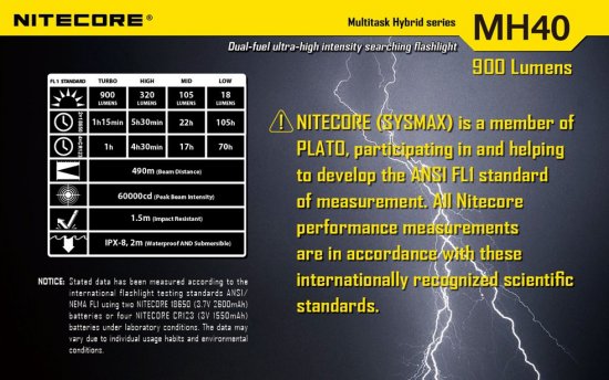 Nitecore gehört der PLATO (Portable Lights American Trade Organization) an und die Lichtleistung der Lampe werden im ANSI/NEMA-FL-1 Standard gemessen. Dieser Standard erlaubt es die wirklich gemessene Lumen der Lampe mit anderen zu vergleichen. Gemessen und auf Verpackungen angegeben werden nach diesem Standard: