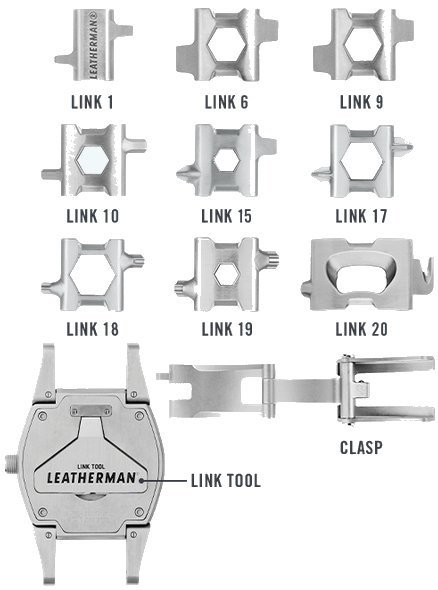 Sie haben nun folgende Möglichkeiten:Die Leatherman Tread Tempo ist eine extrem robuste Uhr mit Saphierkristallglas. In dem korrosionsbeständigem 17-4 Edelstahl Gehäuse sitzt ein präzises Schweizer Ronda Typ 715 Uhrwerk und ist wasserdicht bis 20 bar. Durch die Leuchtmarker im Ziffernblatt und an den Zeigern ist die Leatherman Tread Tempo Uhr auch im dunklem gut ablesbar. Leatherman hat in jedes der 17/4 Edelstahlglieder des Armbandes praktische Werkzeuge integriert wie Inbusschlüssel, Schraubendreher und Ringschlüssel- alles sicher am Handgelenk und schnell einsatzbereit. Die Länge des Armbandes lässt sich in 6mm Schritten an jede Handgelenksgröße anpassen. Individuelle Gestaltung durch Verwendung nur der Elemente, die Sie am häufigsten benötigen. Die Leatherman Tread Tempo Uhr ist nicht nur funktional, sondern sieht auch noch gut aus.