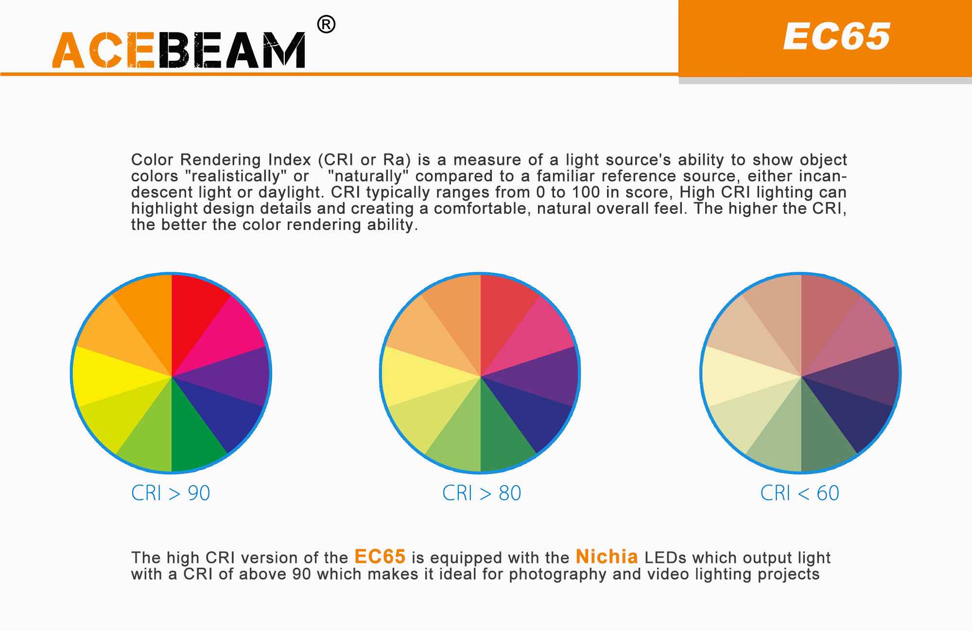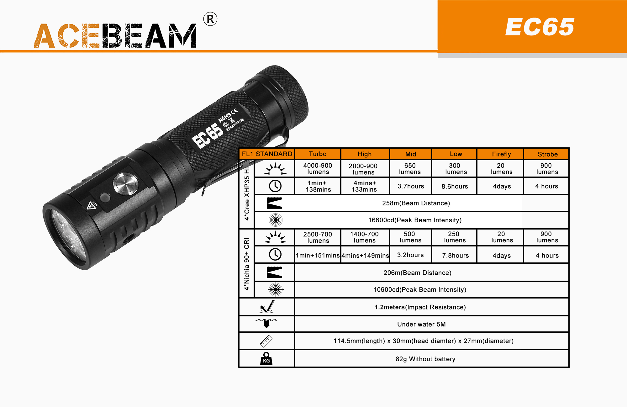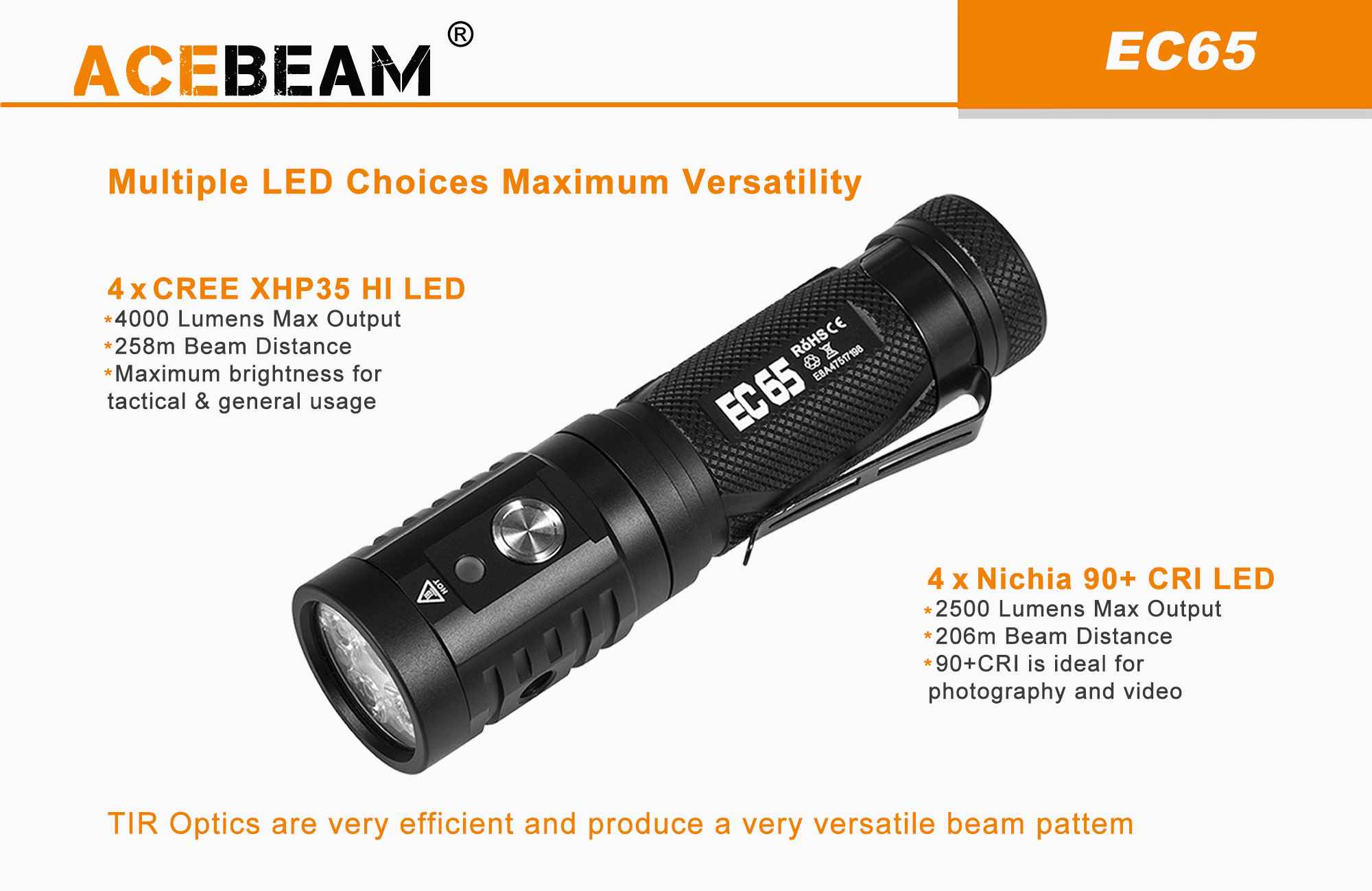 Die Acebeam EC65 gibt es in zwei Versionen. Eine mit 4 Cree XHP35 HI LEDs für größt mögliche Lichtleistung und eine mit 4 Nichia 90+ CRI LEDs für die best mögliche Farbwiedergabe.