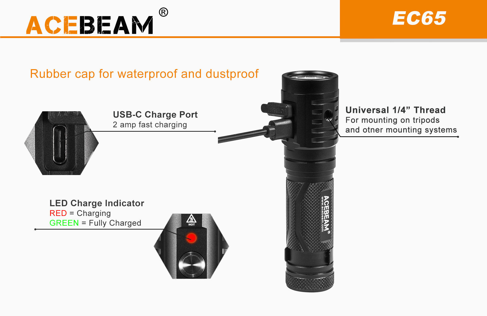 Sie haben nun folgende Möglichkeiten:Die Acebeam EC65 Nichia ist eine wiederaufladbare LED Taschenlampe für Anwendungen in den Bereichen Outdoor, EDC, Camping, Wandern. Die Acebeam EC65 Nichia verwendet vier Nichia 90+ CRI LEDs mit einer maximalen Lichtleistung von 2500 Lumen und eine Leuchtweite von 206 Metern. Die orange peel TIR-Linse ermöglicht eine breite, gleichmäßige Ausleuchtung. Die Acebeam EC65 Nichia ist eine Hochleistungs-Taschenlampe die mit einem seitlichen Lichtschaltern ausgestattet ist. Die Acebeam EC65 Nichia hat fünf Leuchtstufen und Stroboskop. Die LED Taschenlampe wird von einem Acebeam IMR21700 Lithium-Ionen-Akku mit 5100 mAh befeuert (im Lieferumfang enthalten), ist aber auch kompatibel mit 1x IMR18650 oder 2 x CR123A Batterien. Die Acebeam EC65 Nichia wir über ein USB-C Kabel geladen. Als Netzteil kann man jedes Smartphone Netzteil verwenden.