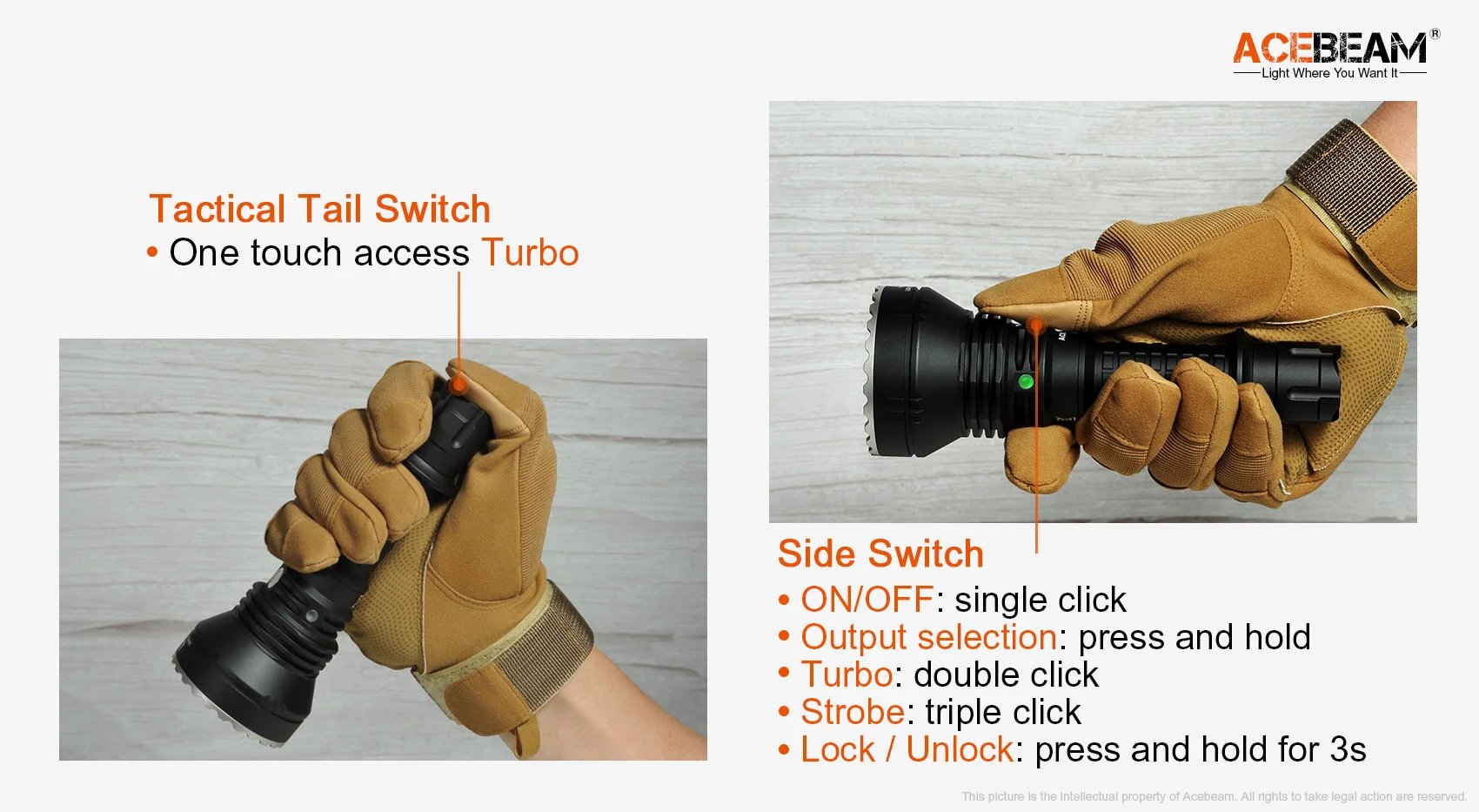 Sie haben nun folgende Möglichkeiten:Die Acebeam L19 ist eine super thrower taktische Taschenlampe mit einem grünen Leuchtstrahl, einer maximalen Leichtweite von 1520 Meter und einer Lichtleistung von 2200 Lumen. Die Taschenlampe wird mit einem 21700 LiIon Akku betrieben (nicht im Lieferumfang). Der seitliche Schalter ist für die einfache, alltägliche Bedienung der Acebeam L19 vorgesehen. Der Heckschalter kann für taktische Einsatz verwendet werden oder gegen einen Kabelschalter (nicht im Lieferumfang) gewechselt werden. Das Acebeam L19 wurde für, die Jagd, Tierbeobachtung und Outdoor Einsätze konzipiert. Das Gehäuse der Acebeam L19 besteht aus HAIII anodisierten Luftfahrt-Aluminium und ist schlagbeständig und wasserdicht. Diese Version der Acebeam L19 wird OHNE Batterien / Akku ausgeliefert.
