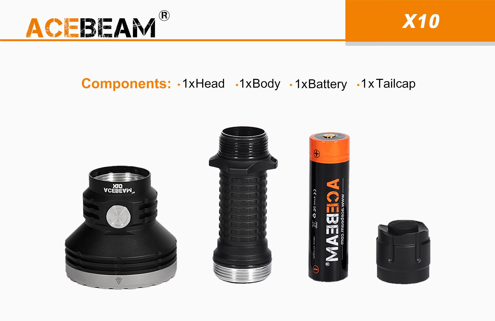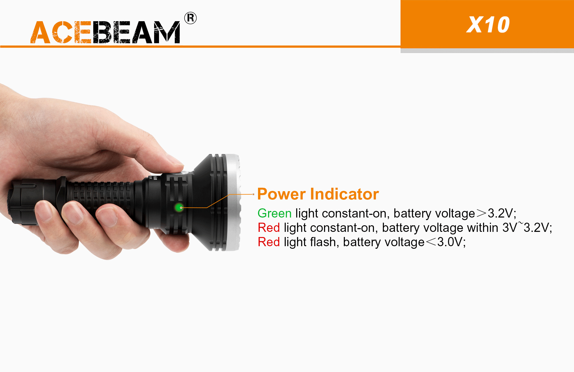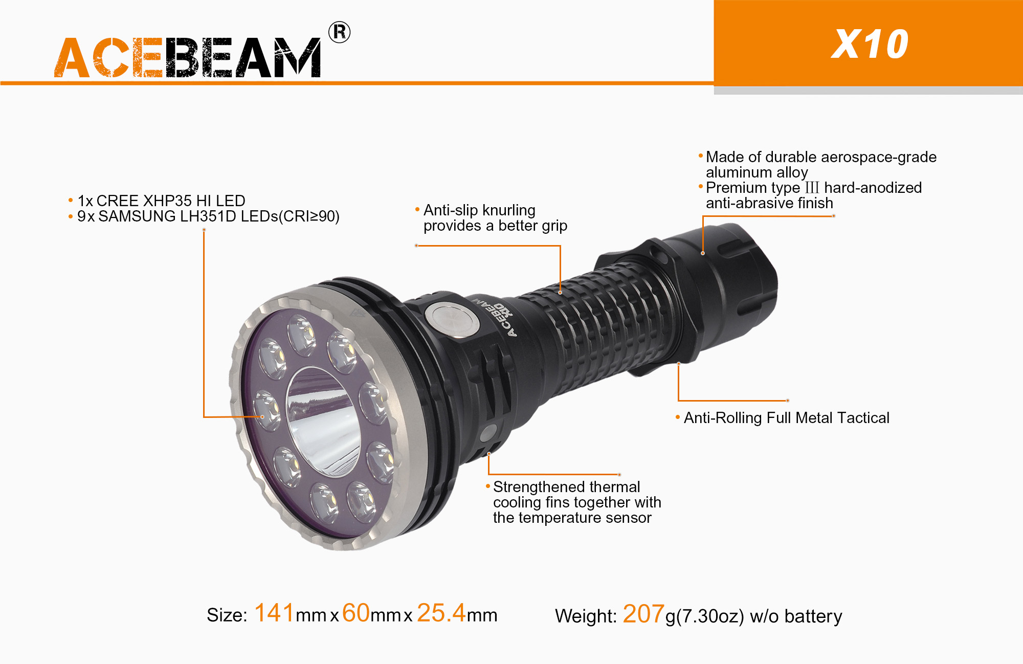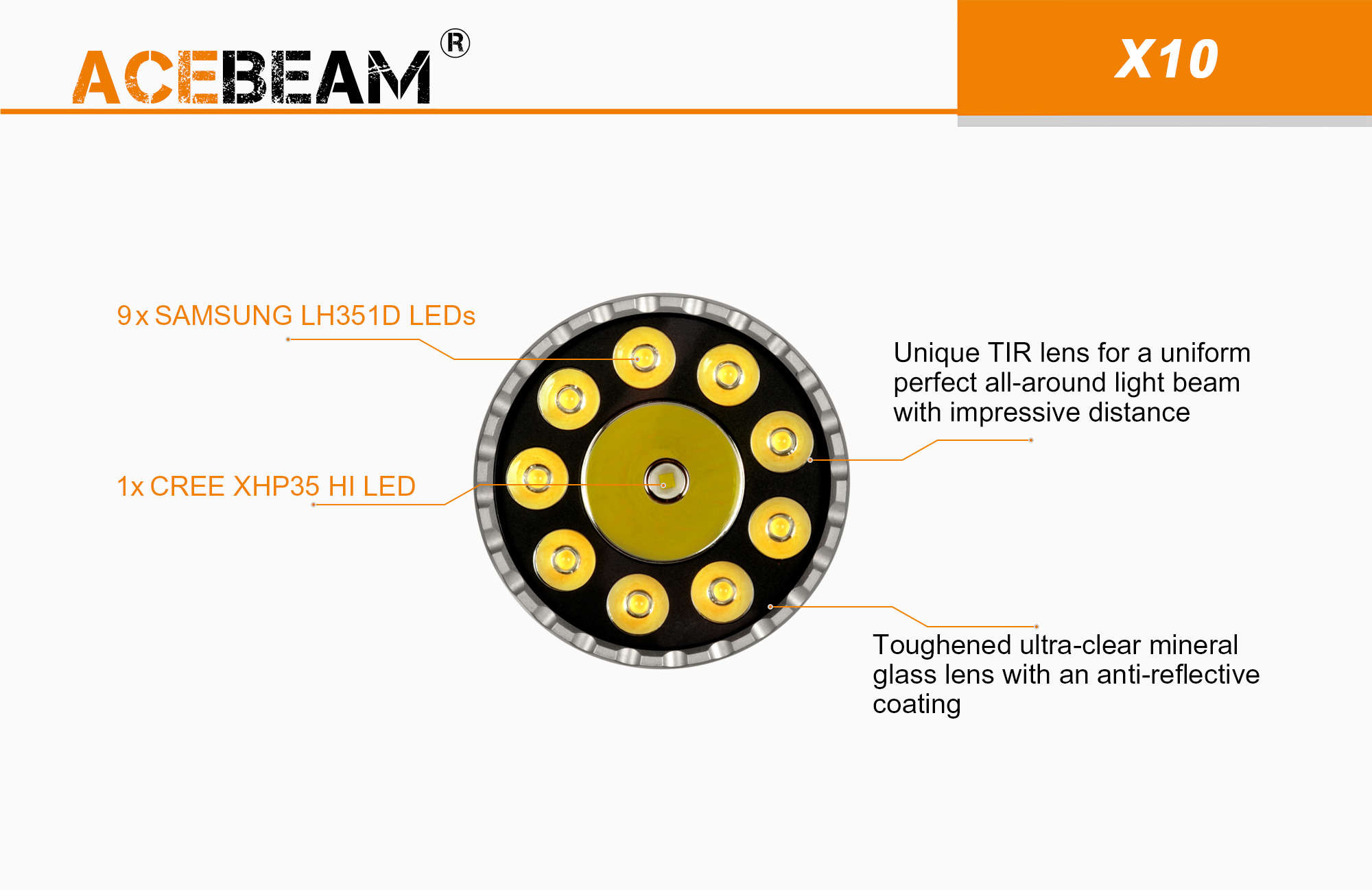Die Acebeam X10 ist eine leistungsstarke, wiederaufladbare, ultrakompakte LED Taschenlampe, die Spot- und Flutlicht kombiniert. Die 9 x SAMSUNG LH351D LEDs (CRI≥90) für den Nahbereich und 1 x CREE XHP35 HI LED für den Fernbereich ermöglichen der Acebeam X10 eine Helligkeit von bis zu 7.000 Lumen und eine Reichweite von bis zu 469 Metern. Die 9 x SAMSUNG LH351D-LEDs (CRI≥90) ähneln der Lichtfarbe des Sonnenlichts. Dadurch werden gegenstände in der natürluchen Fabe angezeigt. Die Acebeam X10 wird von einem, über ein USB-C Kabel Wiederaufladbaren, 21700 Akku betreiben. Die Acebeam X10 eignet sich für zahlreiche Außen- und Extremumgebungen und ist ein unentbehrlicher Helfer bei der Erforschung, Suche und Rettung von Höhlen sowie als Backup-Leuchte für Transportunternehmen. Das Gehäuse der Acebeam X10 besteht aus HAIII anodisierten Luftfahrt-Aluminium und ist schlagbeständig und wasserdicht.