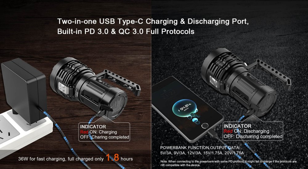 Sie haben nun folgende Möglichkeiten:Die Acebeam X50 LED Taschenlampe ist Suchscheinwerfer und hat mit 8 x CREE XHP70.2 LED eine Leuchtstärke von 40000 Lumen in 6500K Kaltweiß. Der extreme helle und 120 Grad breite Lichtstrahl der Acebeam X50, mit einer Leuchtweite von bis zu 800 Meter, ist ideal geeignet für Such.- und Rettungseinsätze. Der seitliche Druckschalter erleichtert die Bedienung bei allen Helligkeitsstufen erheblich. Mit dem integrierte 4250mAh Li-ion Akkupack, der über USB-C geladen wird, kann man andere Geräte über die Powerbank Funktion mit QC 3.0 aufladen. Das Gehäuse der Acebeam X50 besteht aus HAIII anodisierten Luftfahrt-Aluminium und ist schlagbeständig und wasserdicht.