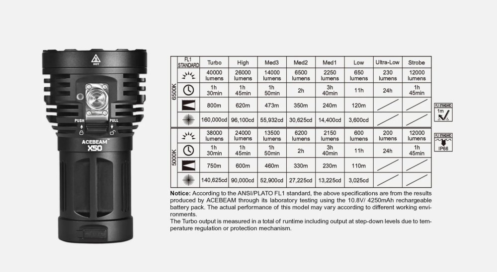 *Gemessen nach dem ANSI/PLATO FL1 2019 Standard: Mit vollständig geladenen Akkus, gemessen wird von 30 Sekunden nach dem Einschalten der X50, bis die Lichtleistung auf 10 % der ursprünglichen Leistung abfällt. Dies ist die gesamte Zeit, in der die X50 genutzt werden kann, bevor die Akkus neu geladen werden müssen. Die Lumenwerte werden somit nicht konstant über den genannten Zeitraum gehalten. Aufgrund des Überhitzungsschutzes ist die angegebene Brenndauer im Turbo ein akkumulierter Wert.