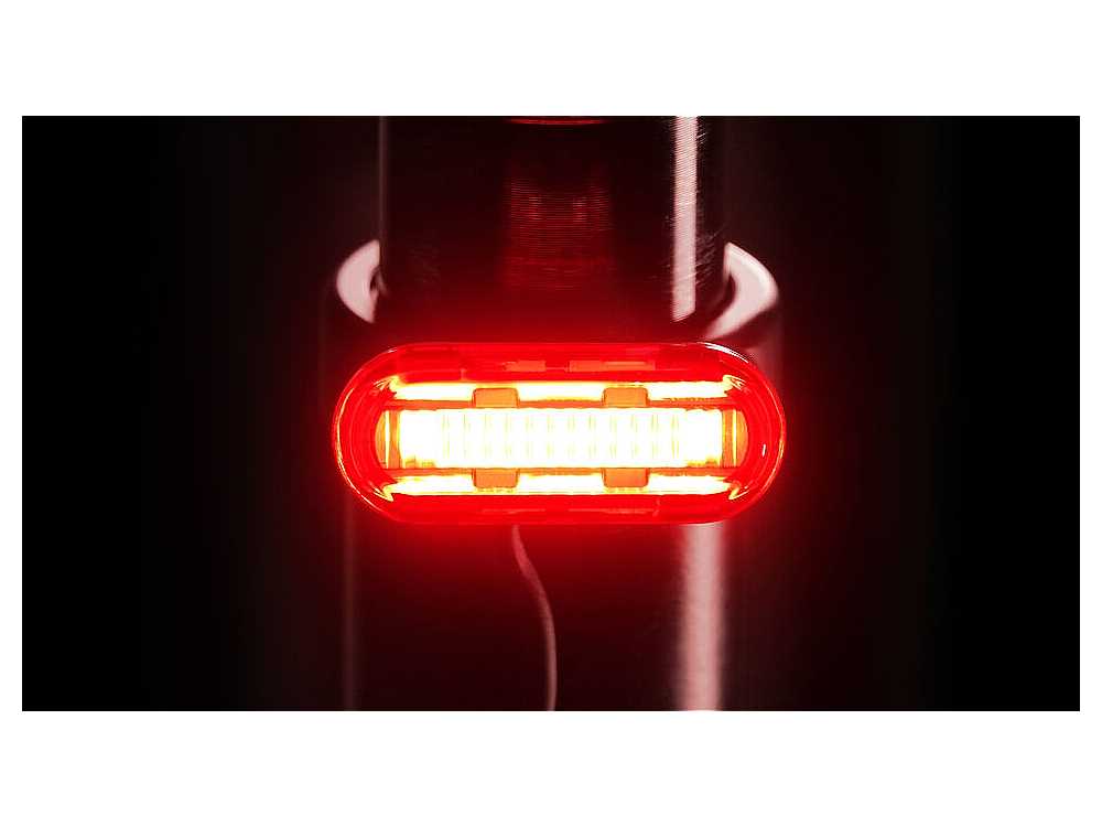 Das Lupine C14 Rücklicht mit Bremslichtfunktion für E-Bikes mit Sattelklemme Montage. Die 45 Lumen starke Rückleuchte besteht aus schwarz eloxiertem, CNC gefrästem Aluminium, die Optik aus robustem Polycarbonat. Durch einen G-Sensor erkennt das Lupine C14 Rücklicht, wenn gebremst wird und leuchtet kurzzeitig heller. Durch COB Technologie und leistungsfähige Fresnel Linsen erreicht das Lupine C14 hohe Sichtbarkeit im Straßenverkehr bei gleichzeitig reduzierter Blendwirkung. Die spezielle Anordnung der 14 LEDs und ein ausgeklügeltes Linsensystem schaffen zudem eine besonders homogene Leuchtcharakteristik.