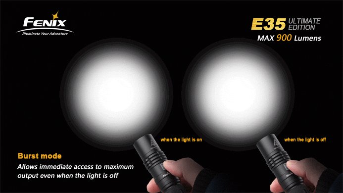 Sie haben nun folgende Möglichkeiten:Die Fenix E35 Ultimate Edition liefert im Burst-Modus 900 Lumen in einem breiten Lichtstrahl. Damit bietet die Fenix E35 Ultimate Edition eine extrem helle und breitere Abdeckung der Umgebung. Die vier Leuchtstufen der LED Taschenlampe kann man einfach über einen Schalter anwählen. Das Design der Fenix E35 Ultimate Edition kennzeichnet sich durch die stilvolle Kühlrippen und das Anti-Roll-Gehäuse aus. Angetrieben von einem 18650 Li-Ion-Akku oder zwei CR123A Batterien, liefert die Fenix E35 Ultimate Edition 900 Lumen Lichtleistung und bis zu 140 Stunden Laufzeit. Diese Version der Taschenlampe wird inkl. Fenix 18650 Akku ARB-L2S mit 3400mAh ausgeliefert.