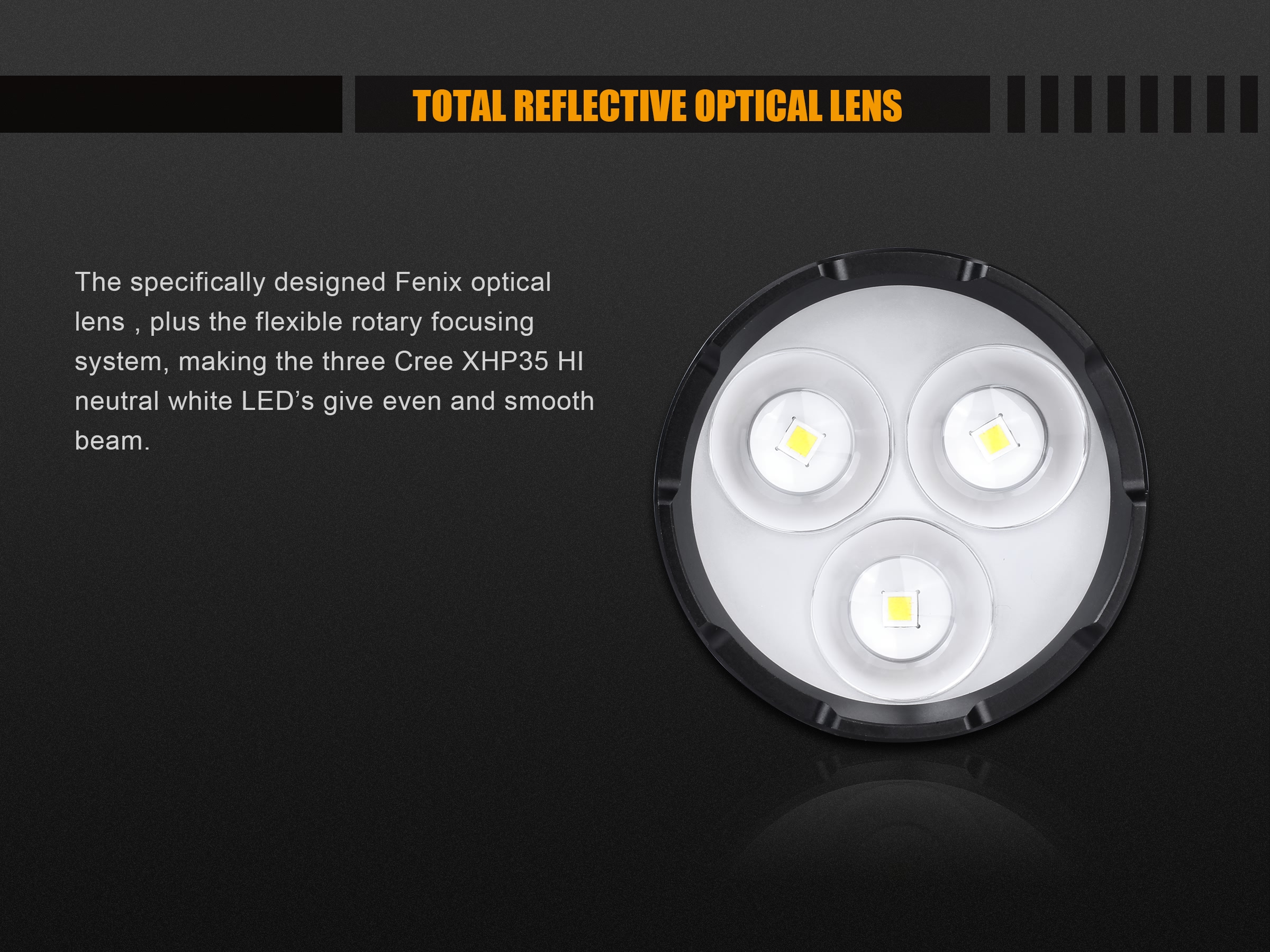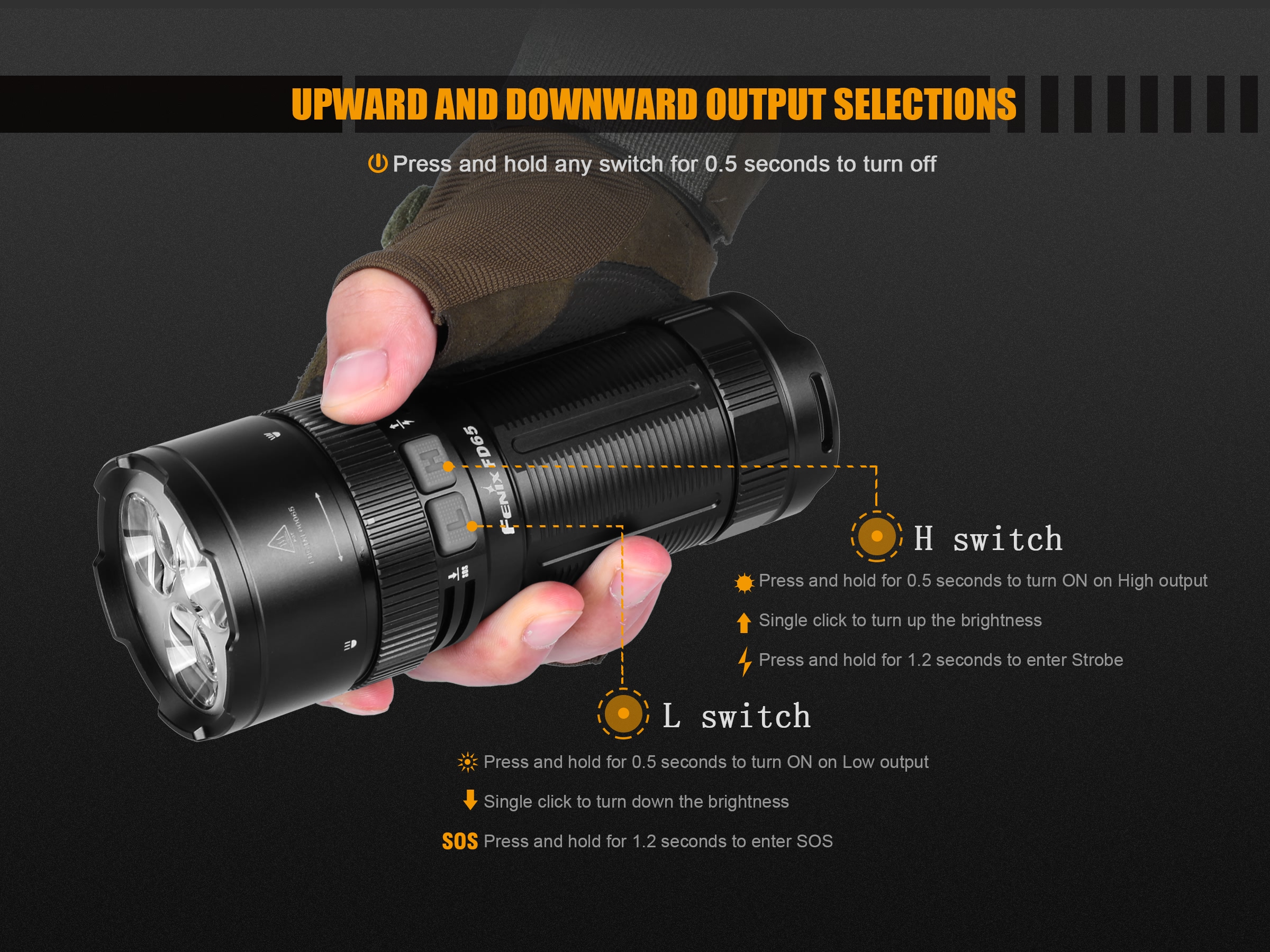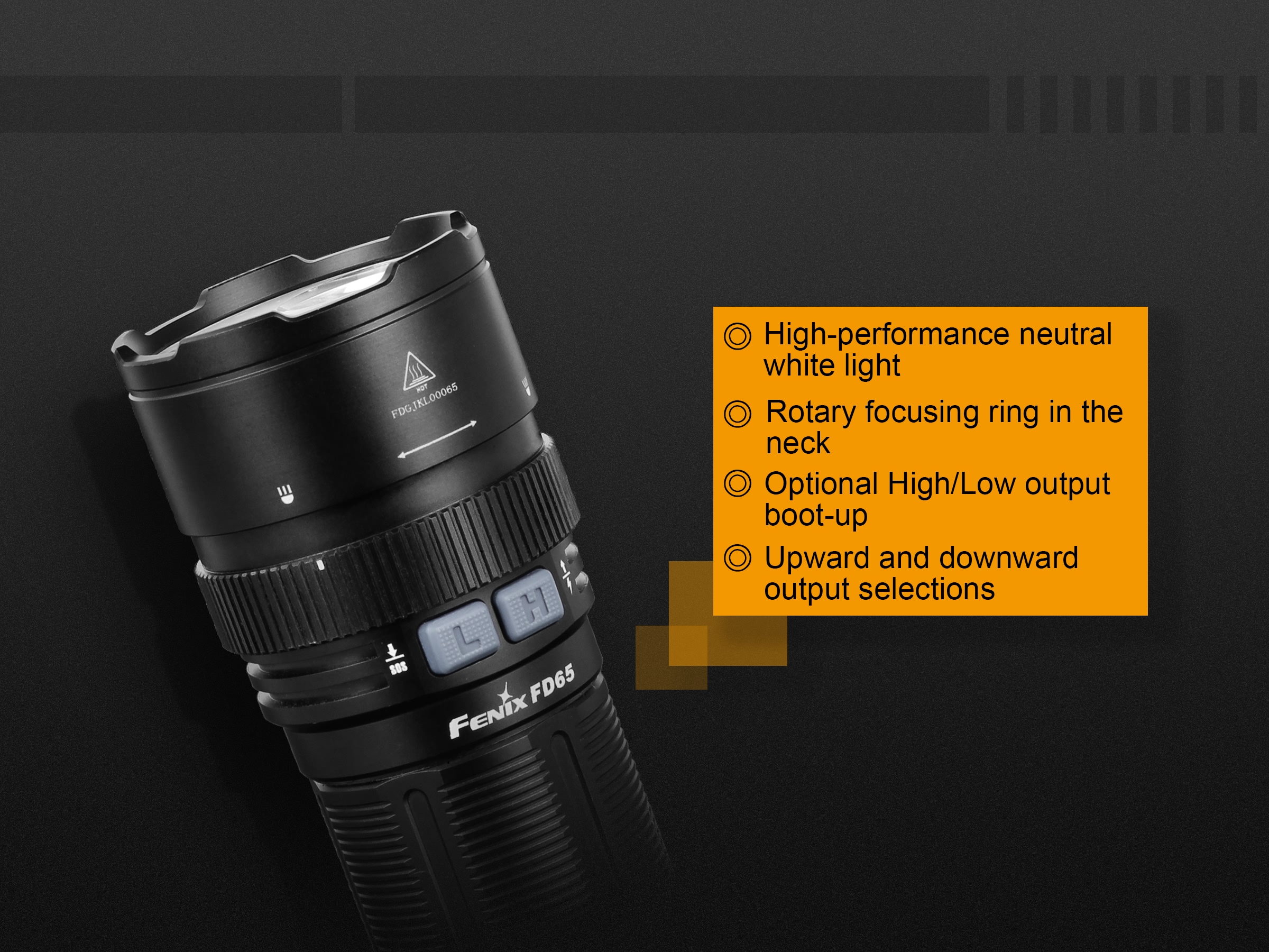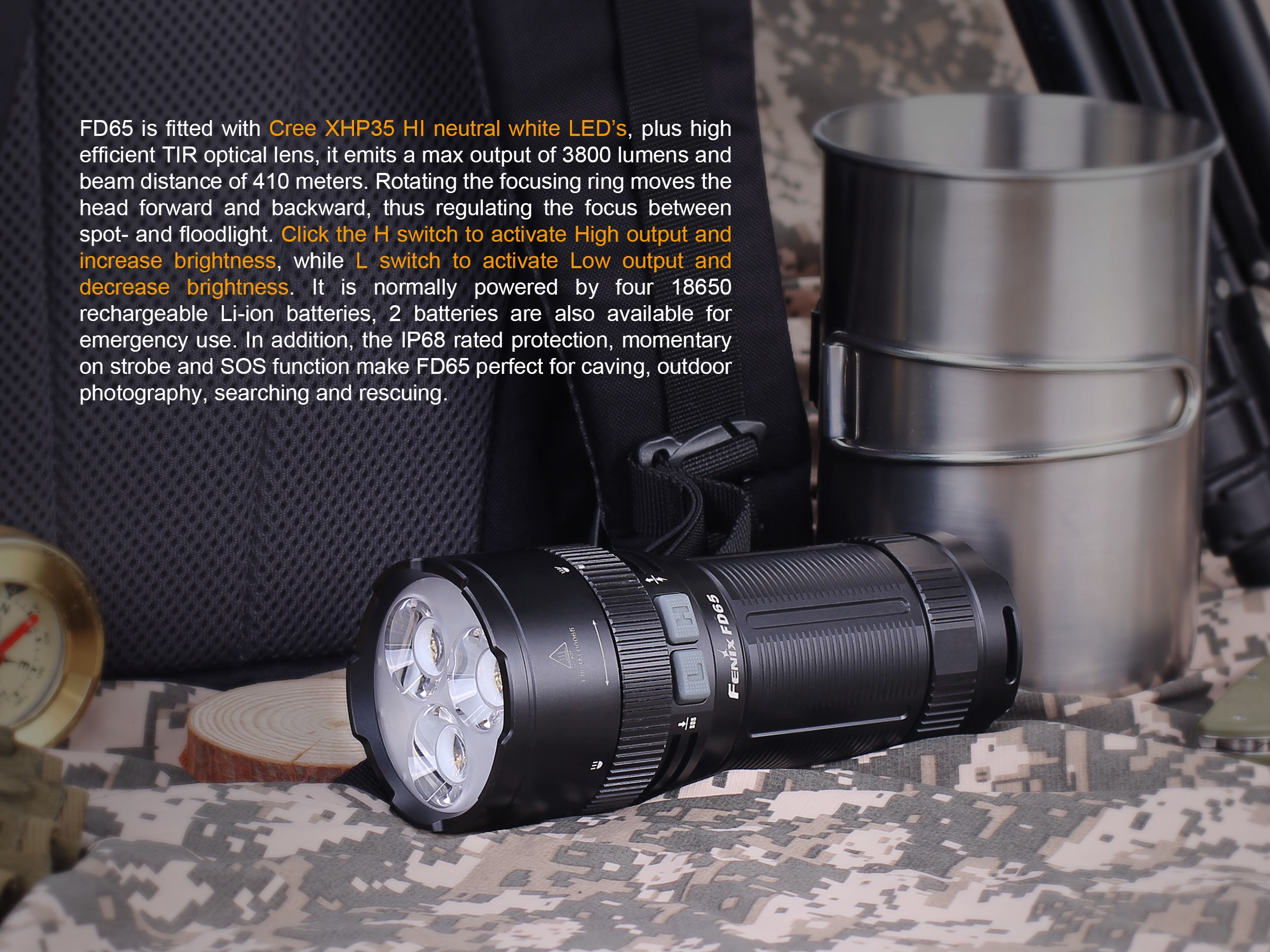 Sie haben nun folgende Möglichkeiten:Die fokussierbare Fenix FD65 LED Taschenlampe ist mit drei neutral weißen Cree XHP35 HI LEDs bestückt und verfügt über eine hocheffiziente optische TIR Linse, die eine maximale Lichtleistung von 3800 Lumen und einen Leuchtweite von 410 Metern hat. Die Fenix FD65 ist optimal für Höhlenforschung, Foto Außenaufnahmen, Such,- und Rettungskräfte. Durch drehen des Fokussierrings wird der Kopf vorwärts und rückwärts bewegt, wodurch die Fokussierung zwischen Spot- und Flutlicht reguliert wird. Durch klicken auf den Schalter H werden die Leuchtstufen hochgeschalten oder das Strobe aktiviert. Durch klicken auf den Schalter L, werden die Leuchtstufen runtergeschalten oder das SOS aktiviert. Die Stromversorgung erfolgt über vier wiederaufladbare 18650 Akkus, im Notbetrieb kann man die Fenix FD65 auch mit zwei Akkus nutzen. Das Gehäuse der Fenix FD65 besteht aus HAIII anodisierten Luftfahrt-Aluminium und ist Wasserdicht nach IP68.