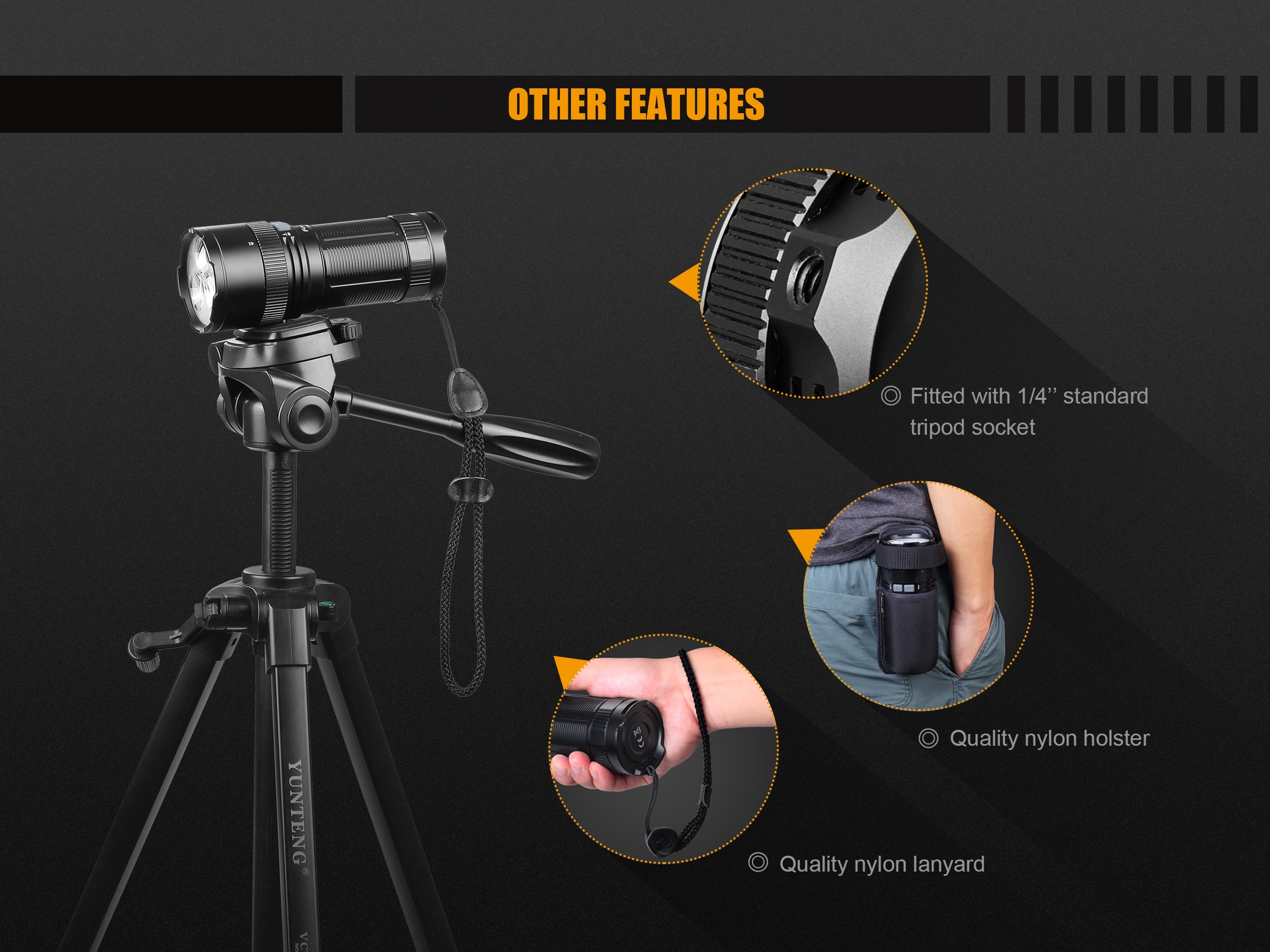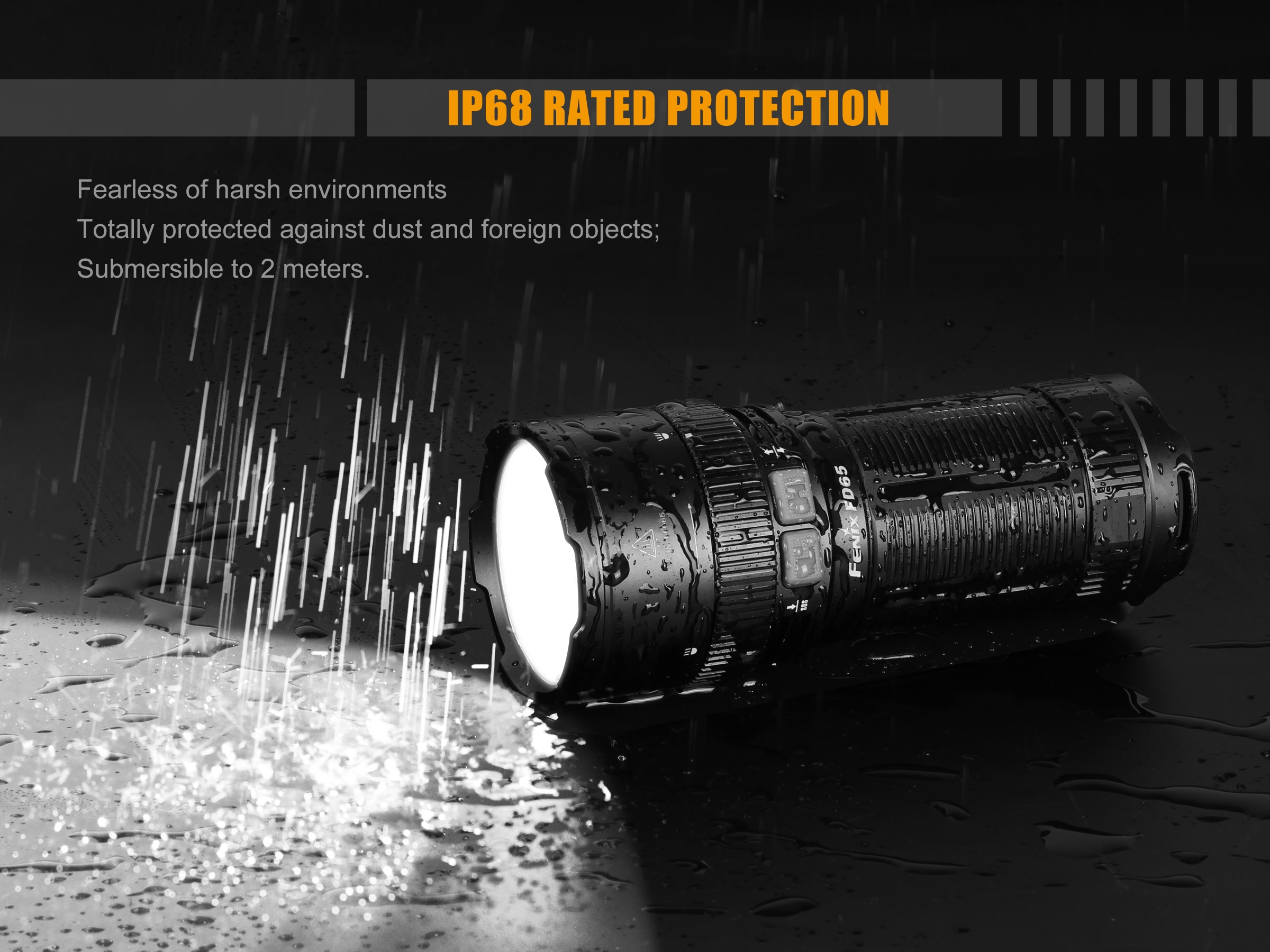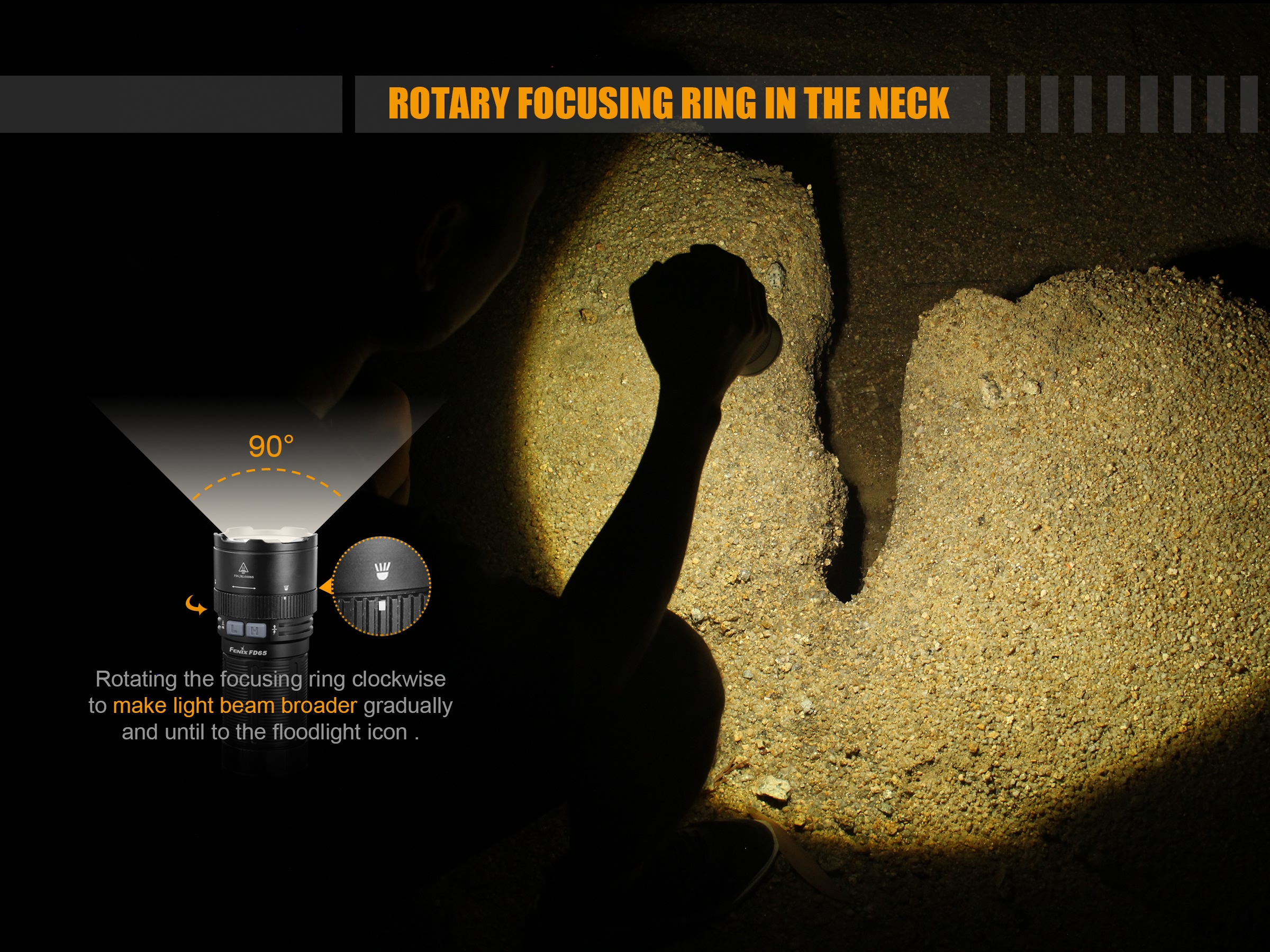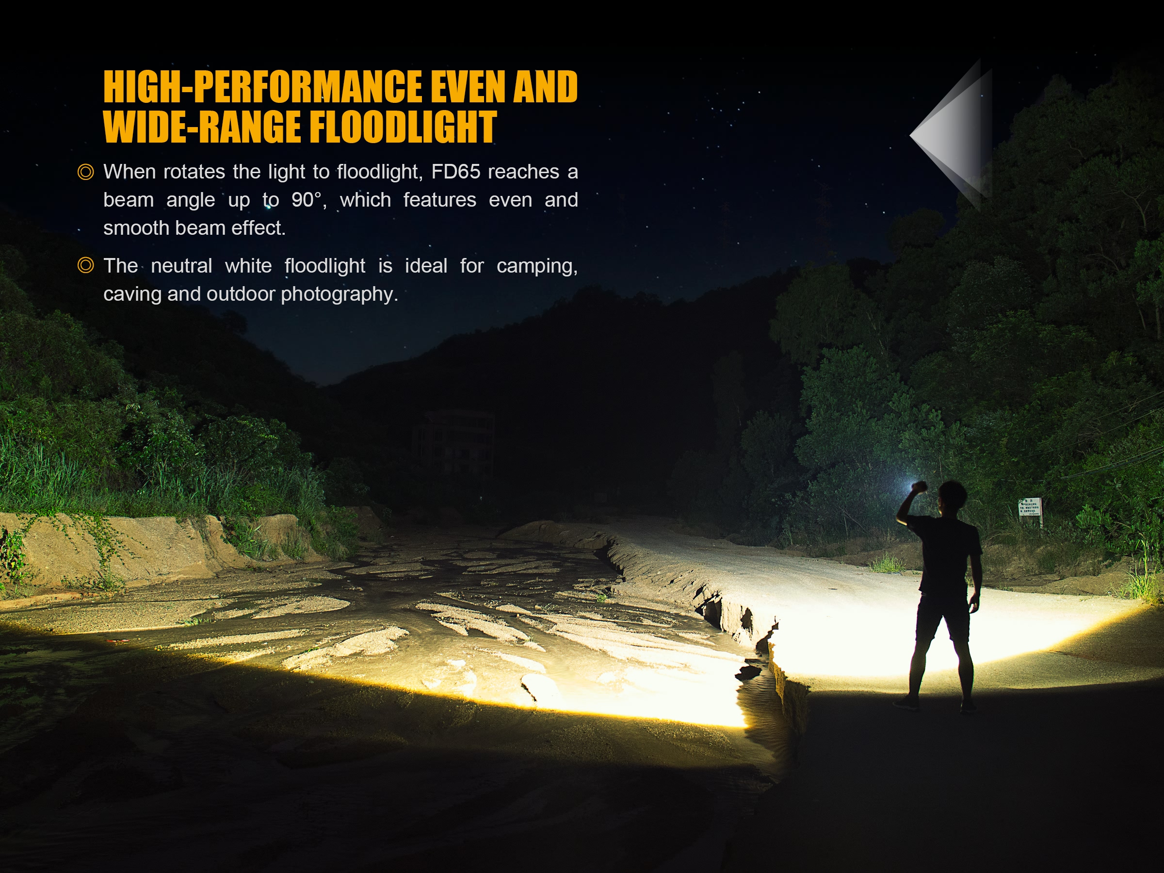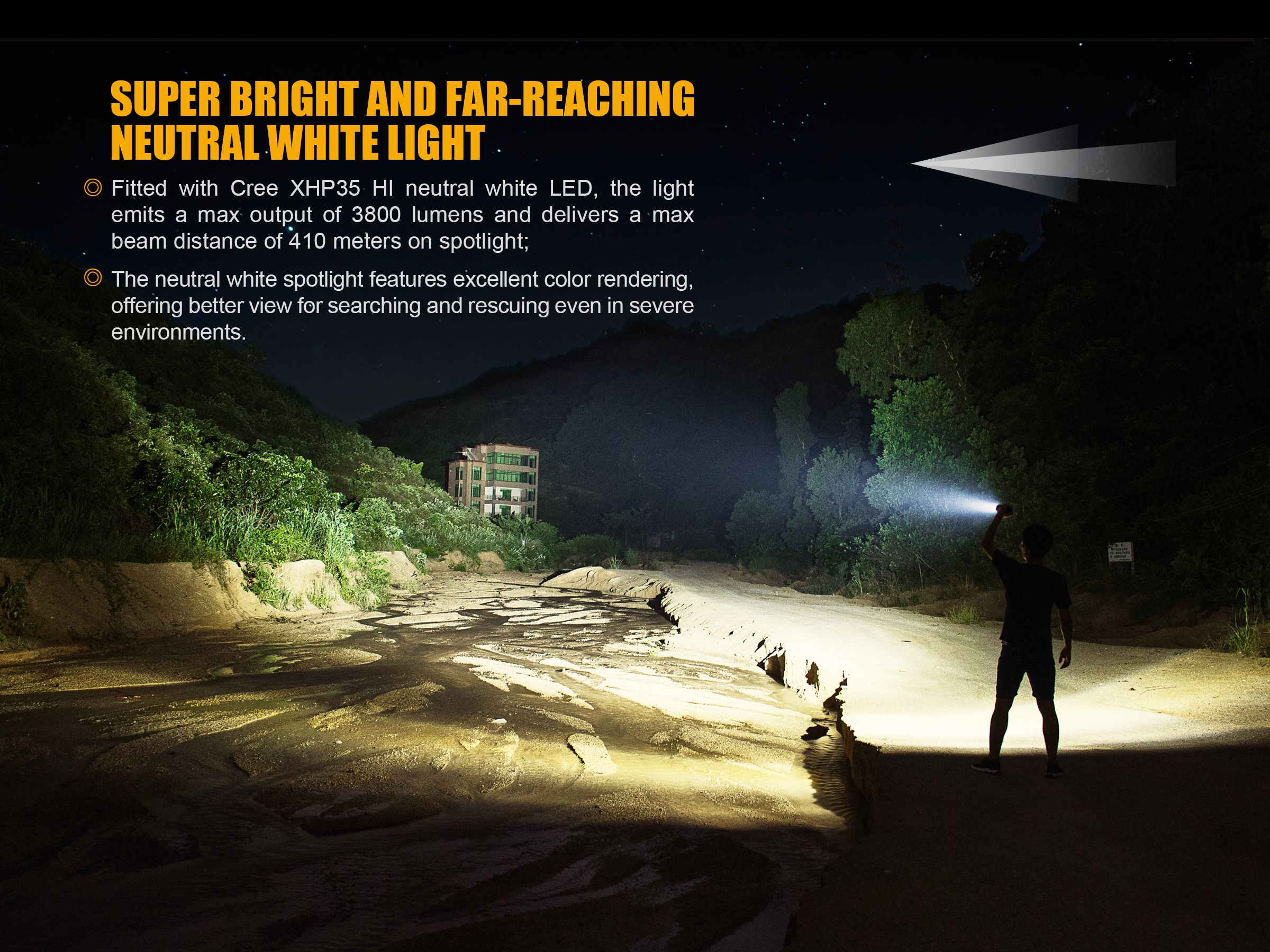 Sie haben nun folgende Möglichkeiten:Die fokussierbare Fenix FD65 LED Taschenlampe ist mit drei neutral weißen Cree XHP35 HI LEDs bestückt und verfügt über eine hocheffiziente optische TIR Linse, die eine maximale Lichtleistung von 3800 Lumen und einen Leuchtweite von 410 Metern hat. Die Fenix FD65 ist optimal für Höhlenforschung, Foto Außenaufnahmen, Such,- und Rettungskräfte. Durch drehen des Fokussierrings wird der Kopf vorwärts und rückwärts bewegt, wodurch die Fokussierung zwischen Spot- und Flutlicht reguliert wird. Durch klicken auf den Schalter H werden die Leuchtstufen hochgeschalten oder das Strobe aktiviert. Durch klicken auf den Schalter L, werden die Leuchtstufen runtergeschalten oder das SOS aktiviert. Die Stromversorgung erfolgt über vier wiederaufladbare 18650 Akkus, im Notbetrieb kann man die Fenix FD65 auch mit zwei Akkus nutzen. Das Gehäuse der Fenix FD65 besteht aus HAIII anodisierten Luftfahrt-Aluminium und ist Wasserdicht nach IP68.