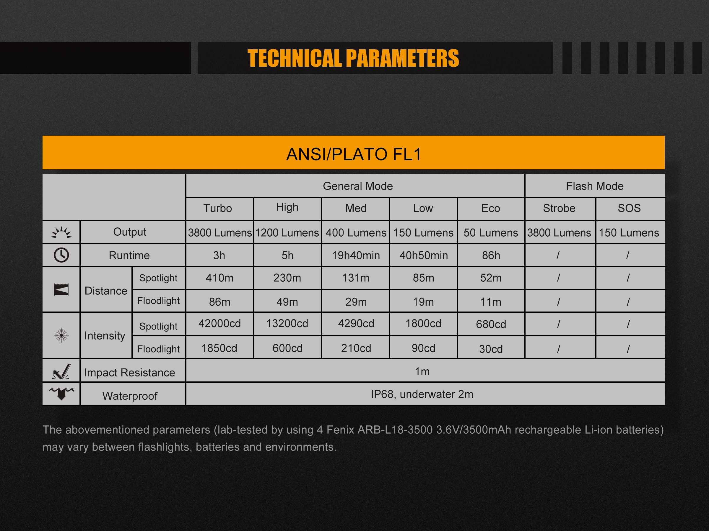 - Leuchtstufen und Lichtstärke mit einem Fenix 18650 LiIon Akku mit 3500mAh: