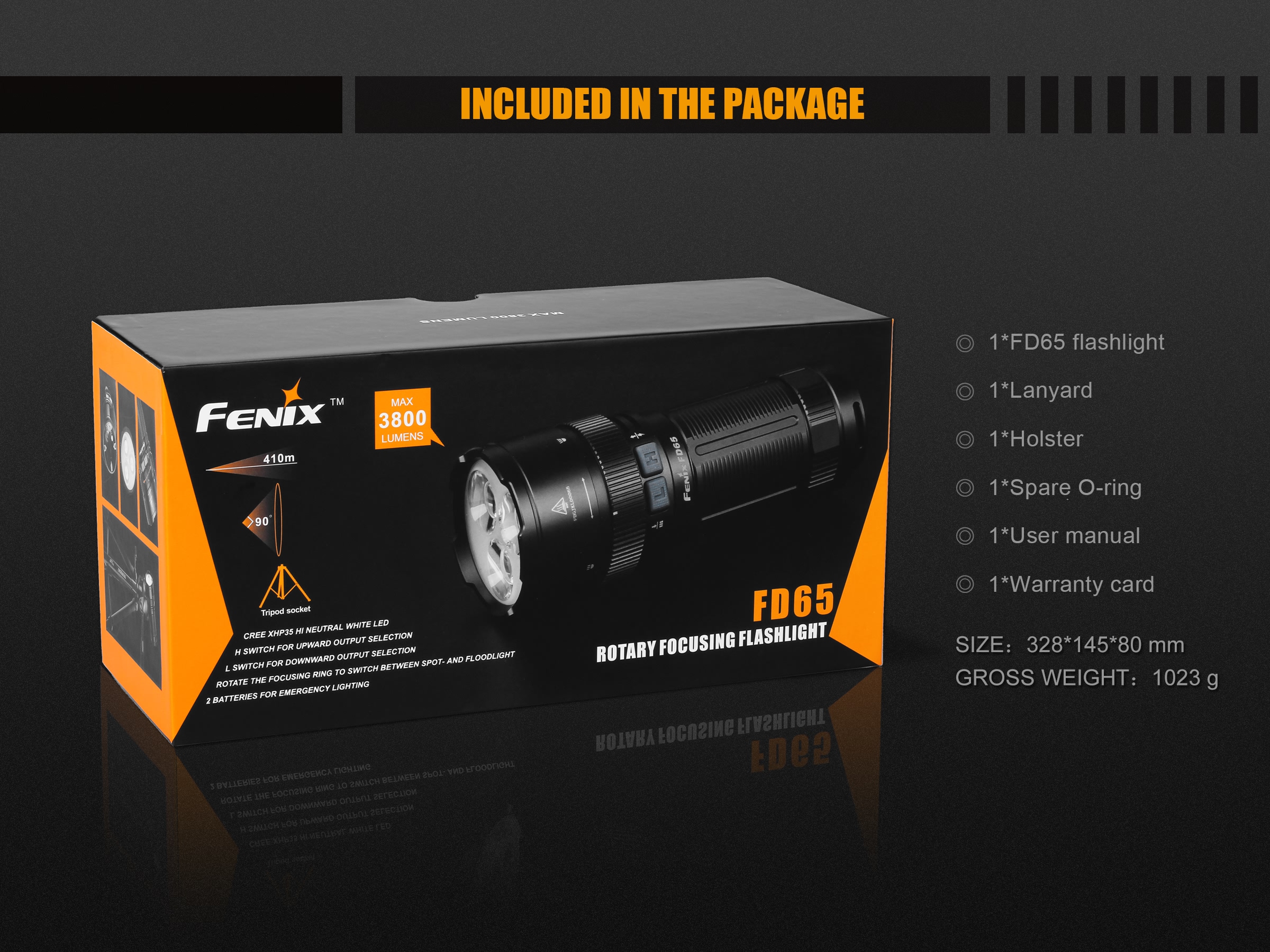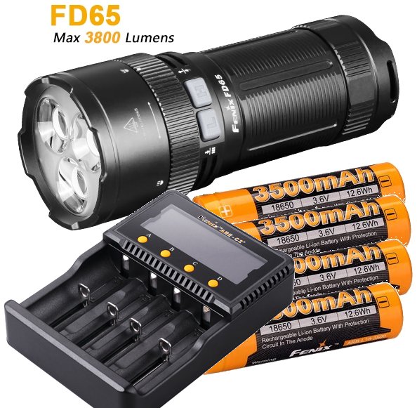 Diese Version der Fenix FD65 wird inkl. vier Fenix ARB-L18-3500 - 18650 LiIon Akkus mit 3500mAh und einem Fenix ARE-C2+ Vierschacht-Ladegerät ausgeliefert.