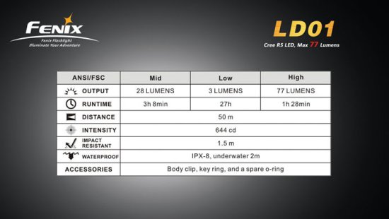 Die Fenix LD01, schwarz LED Taschenlampe ist ausgestattet mit einer Cree XP-E LED. Diese ermöglicht aus nur einer AAA Batterie 77 Lumen an Lichtleistung zu generieren. Die Leuchteinheit ist digital geregelt und bietet dadurch eine nahezu konstante Helligkeit.