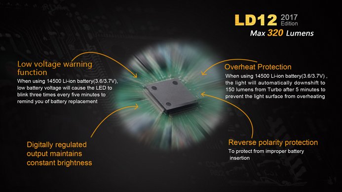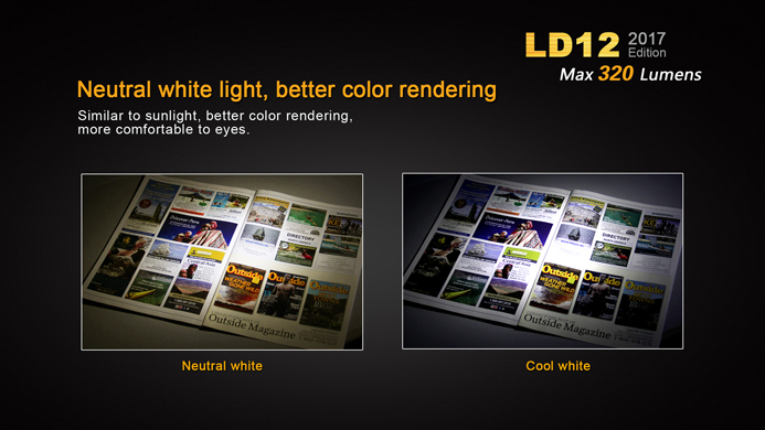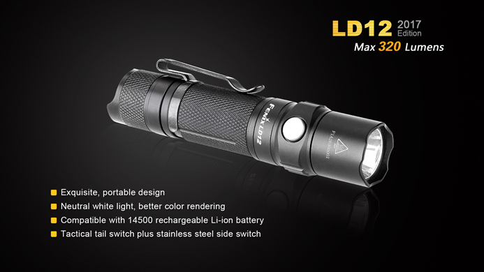 Sie haben nun folgende Möglichkeiten:Die Fenix LD12 2017 Edition ist eine kleine aber Leistungsstarke LED Taschenlampe für den täglichen Gebrauch. Die CREE XP-G2 R5 hat ein neutral weißes Licht um Farben und Kontraste optimal zu erkennen. Die Fenix LD12 2017 Edition hat jetzt eine Leuchtstärke von 320 Lumen und eine Leuchtweite von bis zu 135 Meter. Das kompakte und extrem robuste Gehäuse aus Flugzeugaluminium ist schlagbeständig und wasserdicht. Mit vier Leuchtstufen und Strobo ist diese Taschenlampe für jeden Einsatz gewappnet. Diese Version der Fenix LD12 2017 Edition wird inkl. einer AA Batterie ausgeliefert.
