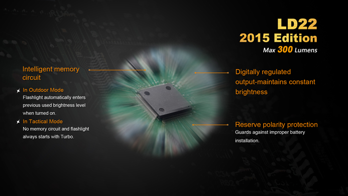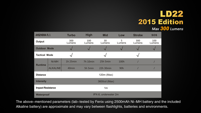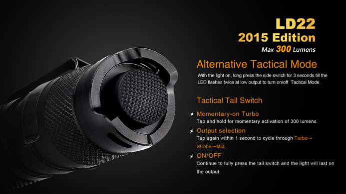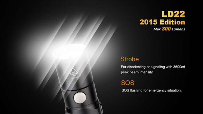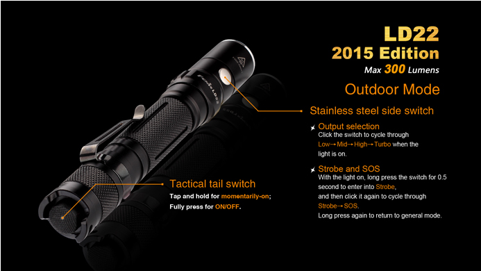 Sie haben nun folgende Möglichkeiten:Die Fenix LD22 2015 Edition ist eine multifunktionale Taschenlampe, die bei der Verwendung von 2 normalen AA / Mignon Zellen bis zu 300 Lumen Helligkeit liefert. Die Fenix LD22 2015 Edition hat vier Helligkeitsstufen, SOS und SOS. Dadurch kann die Fenix LD22 2015 Edition für den Outdoor- als auch taktischen Betrieb konfiguriert werden.
